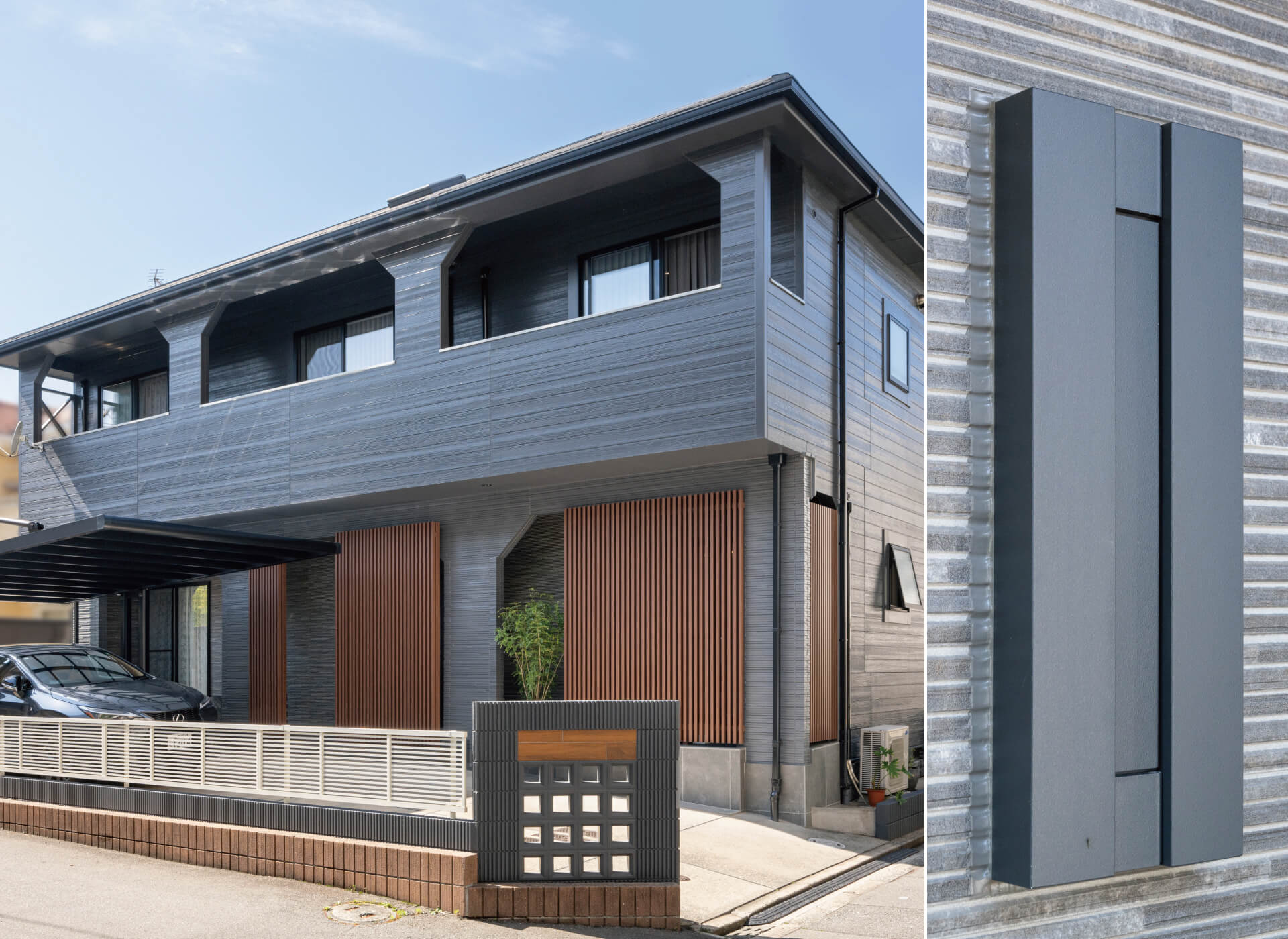 ダークグレーの外壁にミディアムブラウンの縦格子を合わせたシックな装い。サインポストはブラックでコーディネイト。