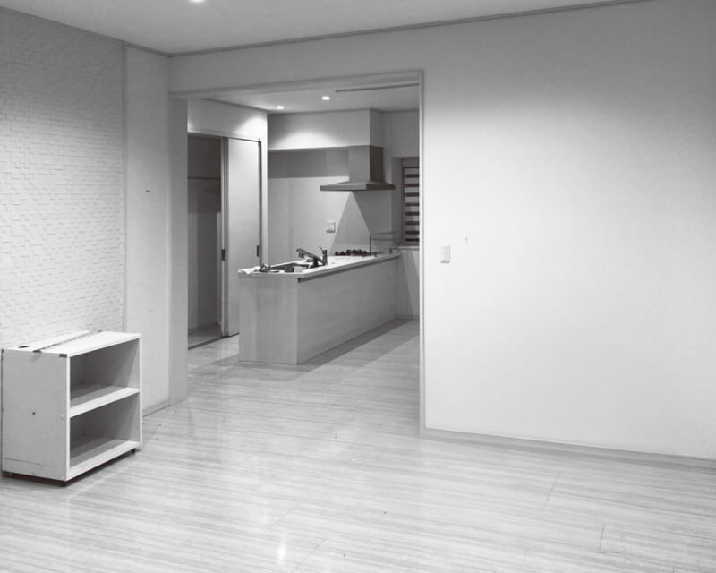 奥様のご両親との同居を機に、3軒長屋を二世帯住宅にリノベーション。家族が集まる2階の子世帯キッチンは、みんなで料理ができるよう2列配置に。シンク側に立つとリビング・ダイニングでくつろぐ家族と会話でき、食事の時間はずっと団らんが生まれます。