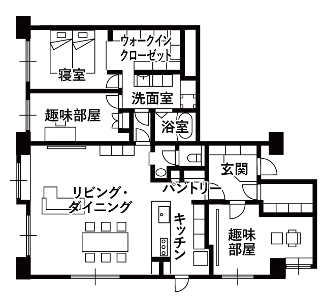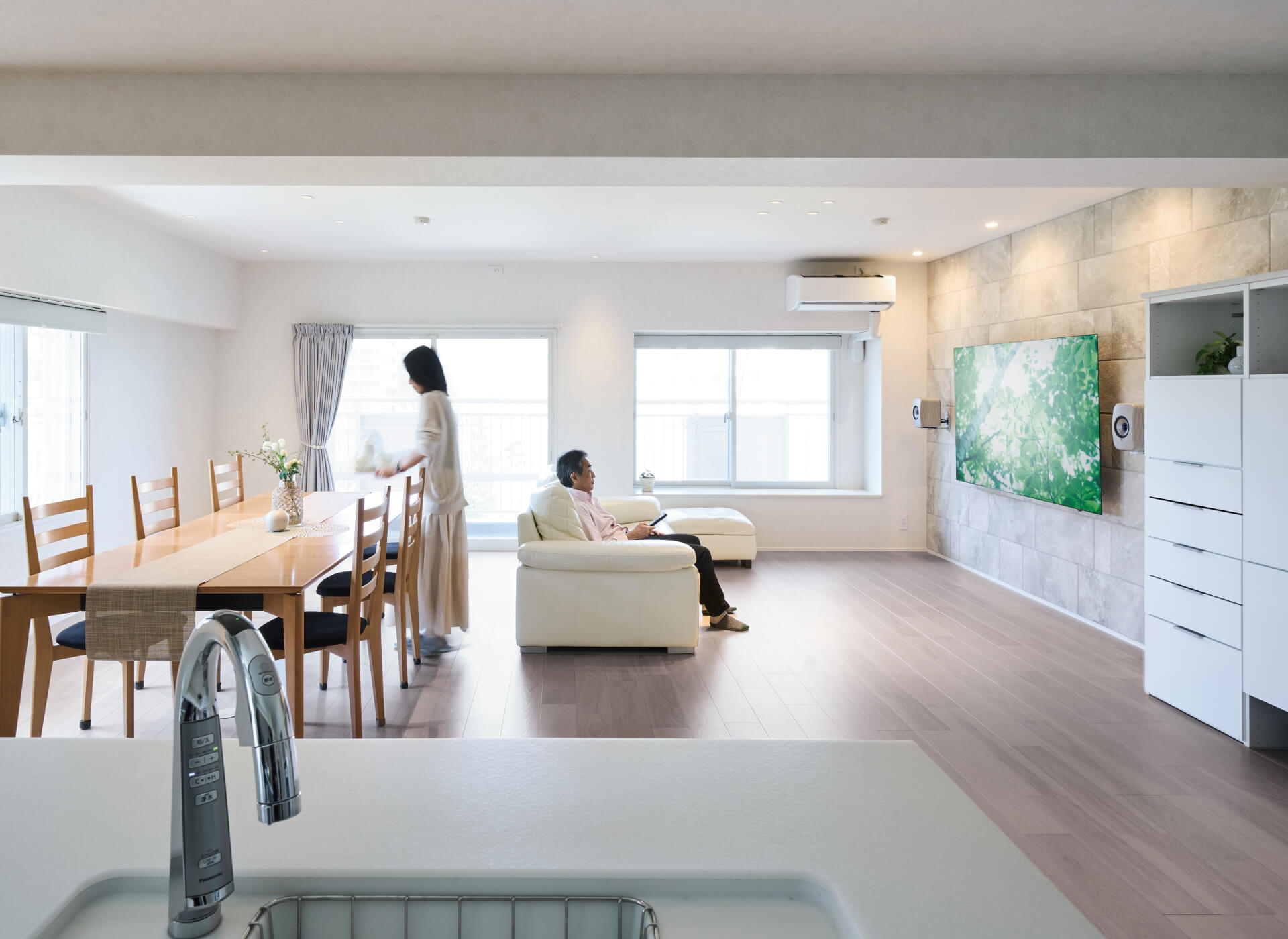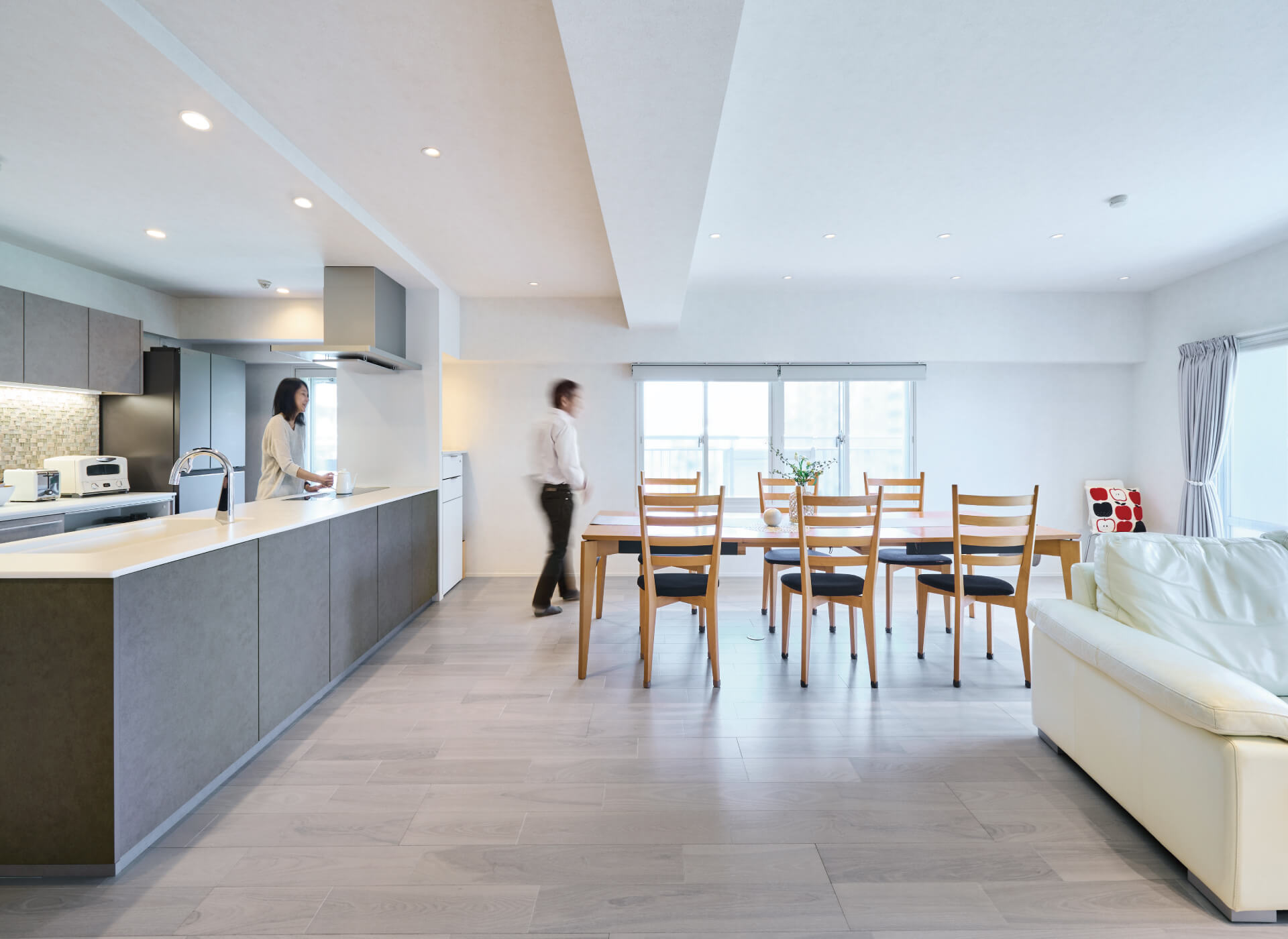 多趣味で、ホームパーティをよく開かれるK様は、より広い中古マンションをリノベーション。LDKを拡大しゲストをおもてなしするパーティスペースに。さらに、ご夫婦それぞれの趣味室を設け、暮らしの動と静、両方を楽しんでおられます。