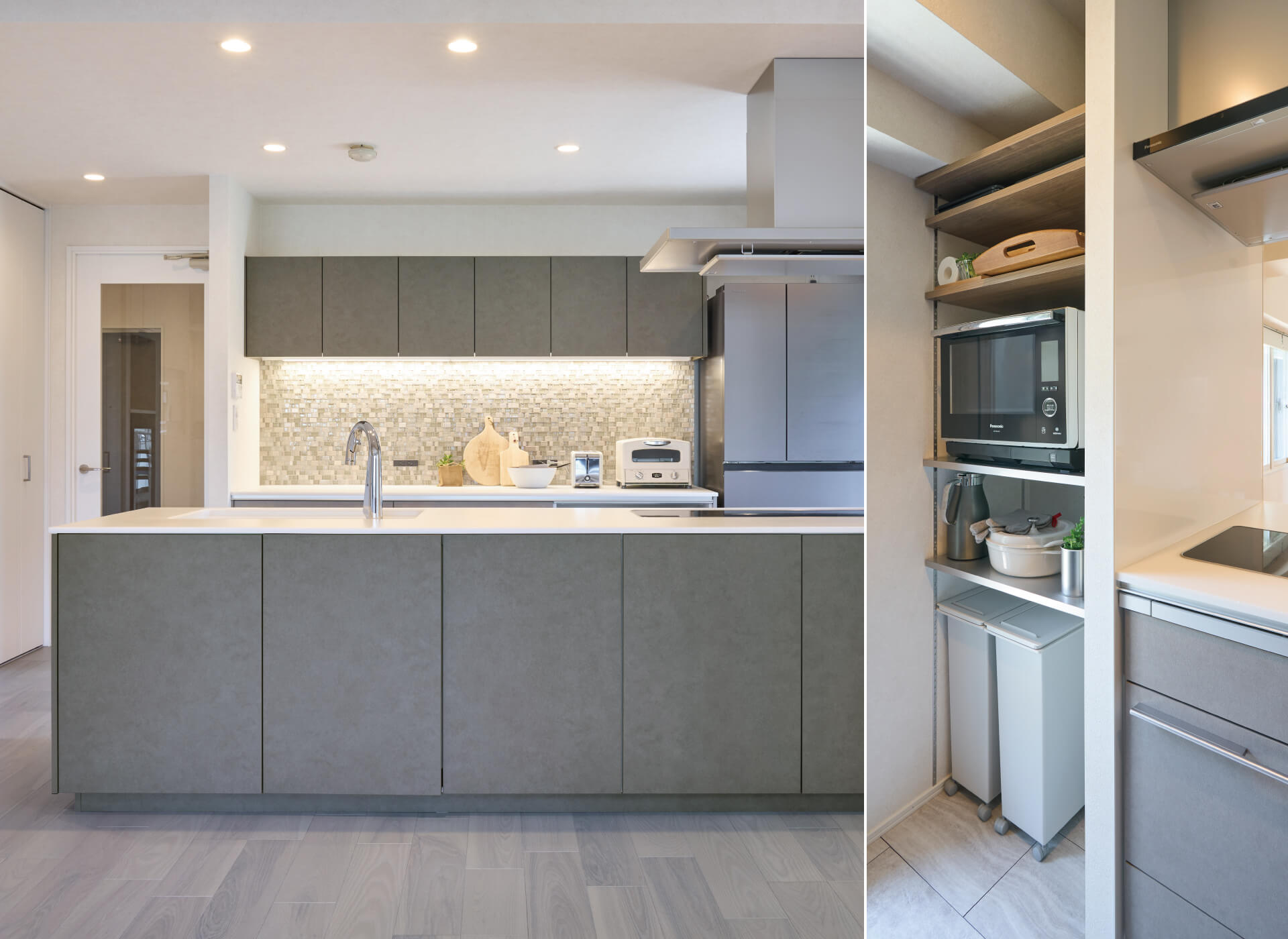 白が基調の空間にキッチンはグレージュを、背面壁にはモザイクタイルをチョイス。生活感のある家電製品やゴミ箱はゲストに見えないよう収納。