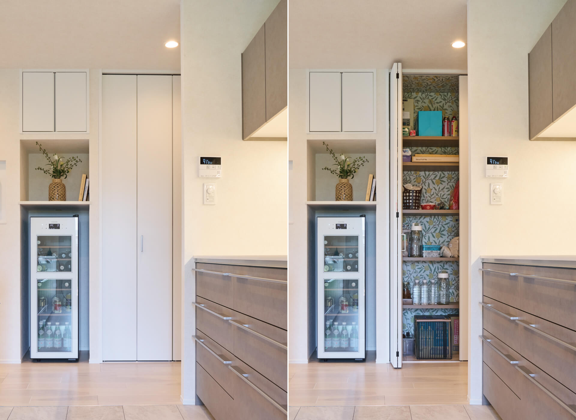 ワインセラーとパントリーはゲストが使いやすい場所に。パントリーの扉を開けたままでも行き来しやすいよう通路は広く。