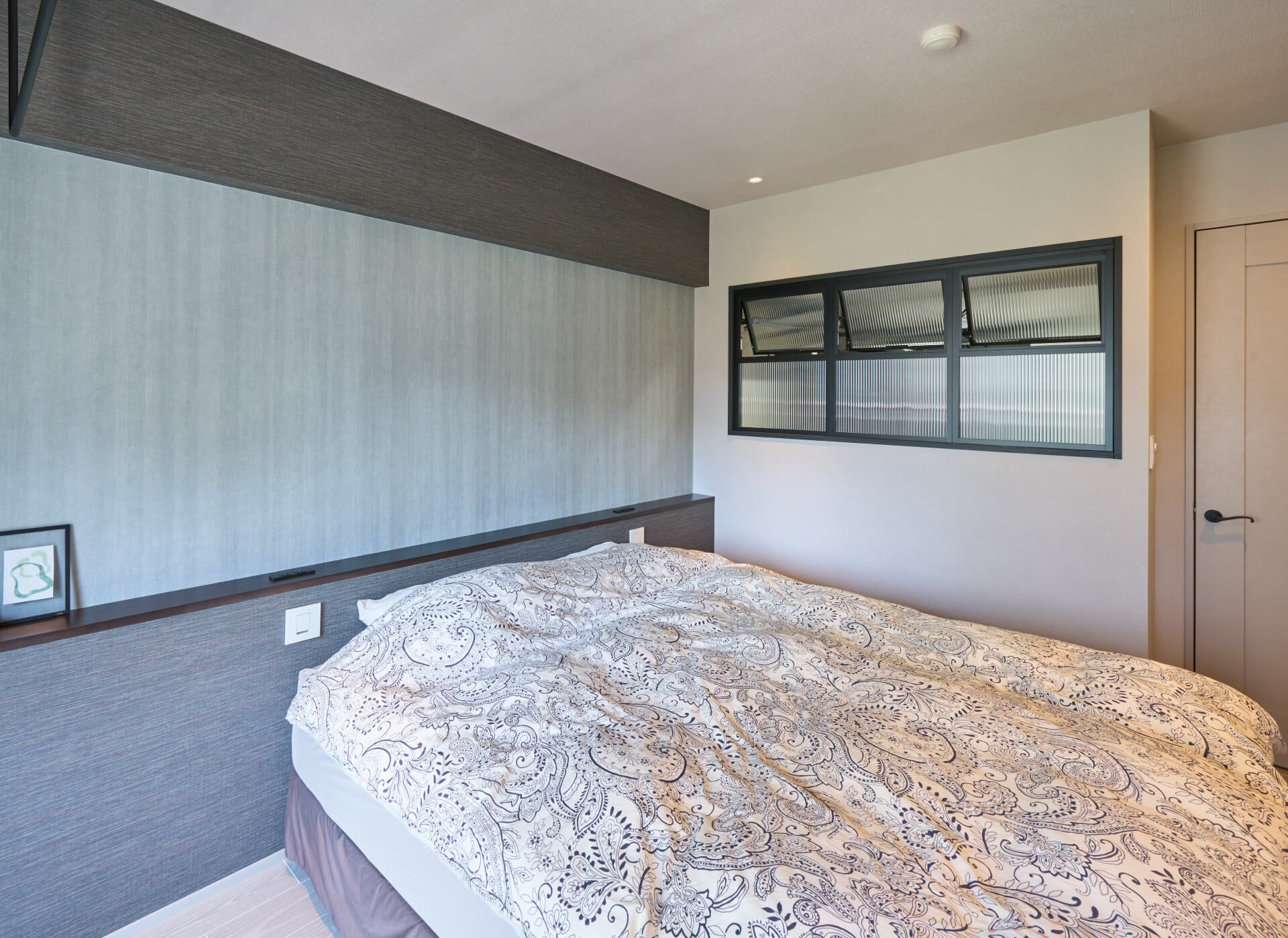 寝室は落ち着いたダークカラーでホテルのように。ブルーグリーンの壁紙を合わせました。隣接するウォークインクローゼットの換気と採光に考慮し、室内窓を設けました。