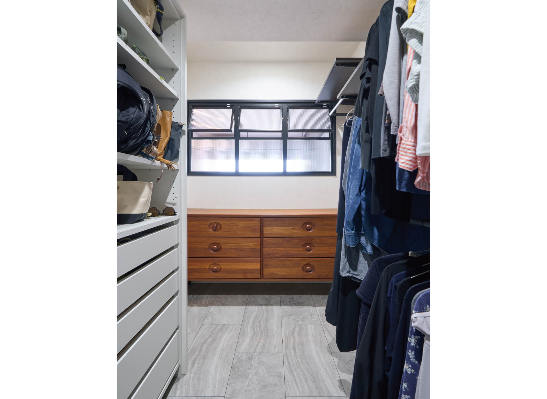寝室隣のウォークインクローゼットは採光のため室内窓を設置。ブティックのようなオープンクロークにして、出し入れしやすく。