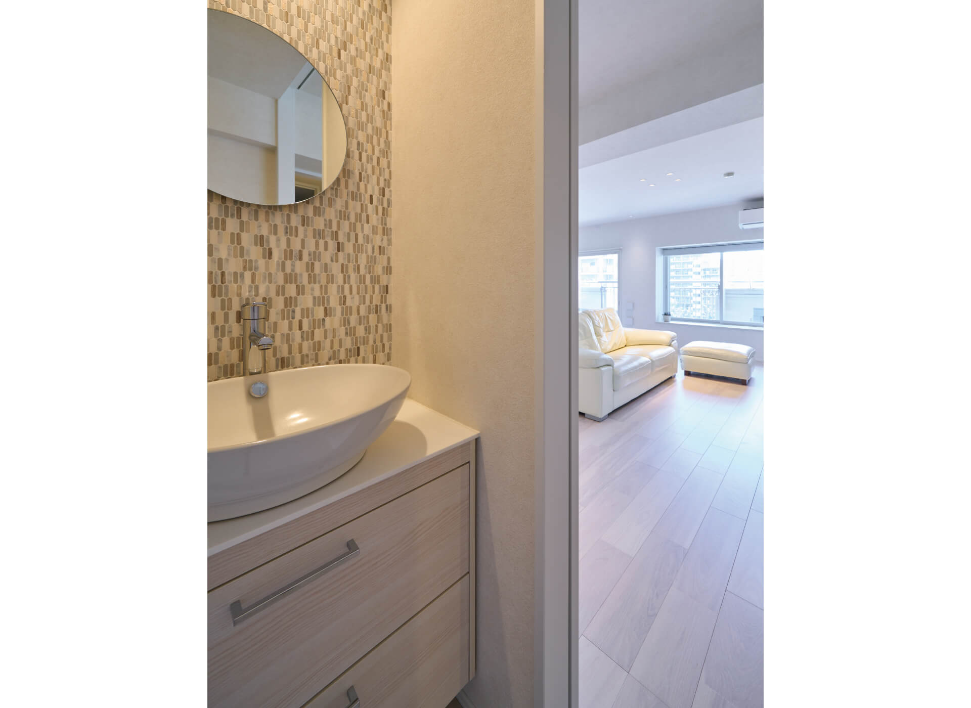 ゲストに配慮して、トイレの入り口を見えにくい位置に変更。前室に手洗いやメイク直しを気兼ねなくできる、コンパクトな洗面室を設けました。