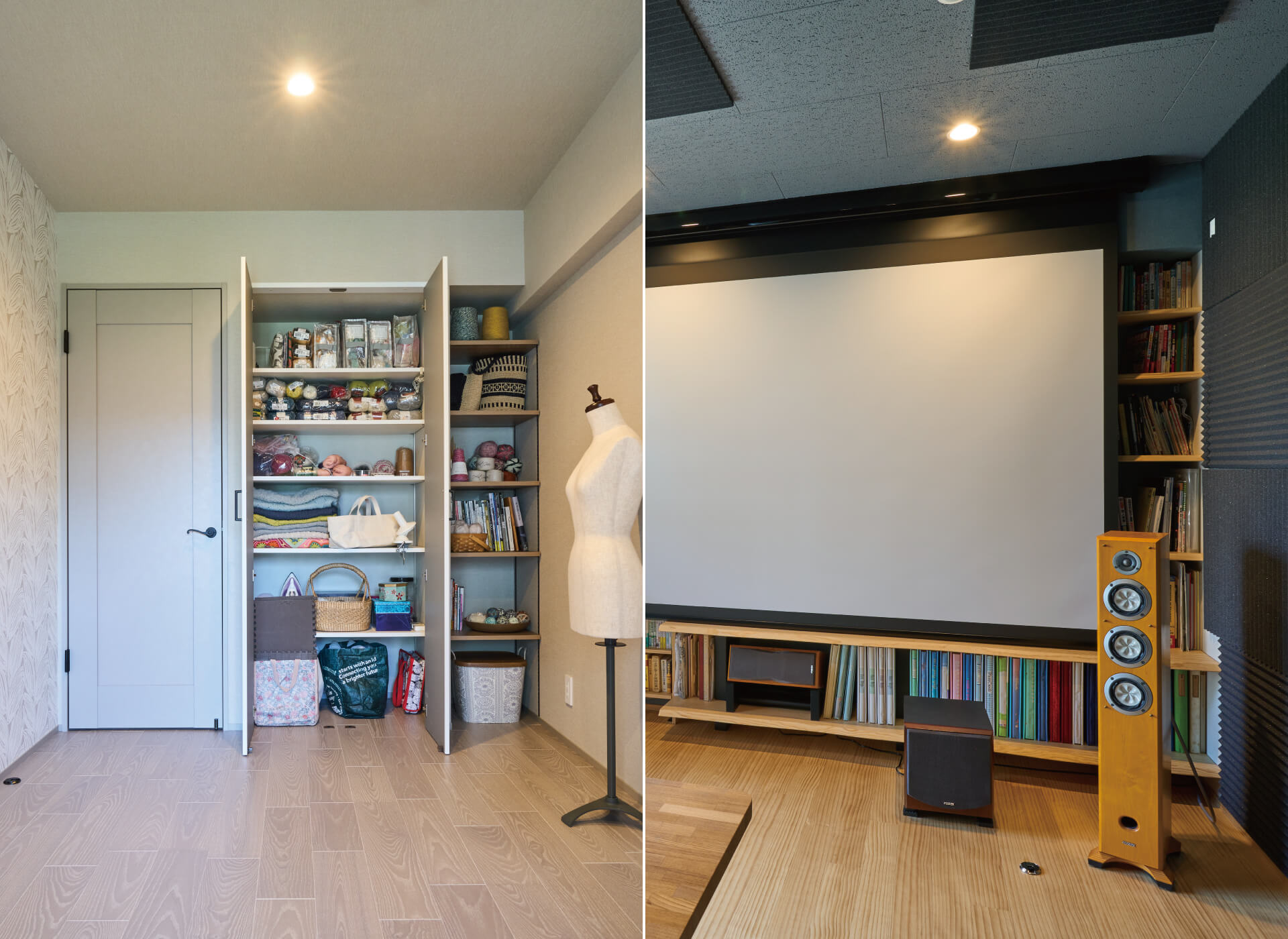 左は、奥様が趣味の編み物を楽しむ部屋。右は、ご主人のシアタールーム。趣味に没頭して、ひとりを楽しめる空間です。