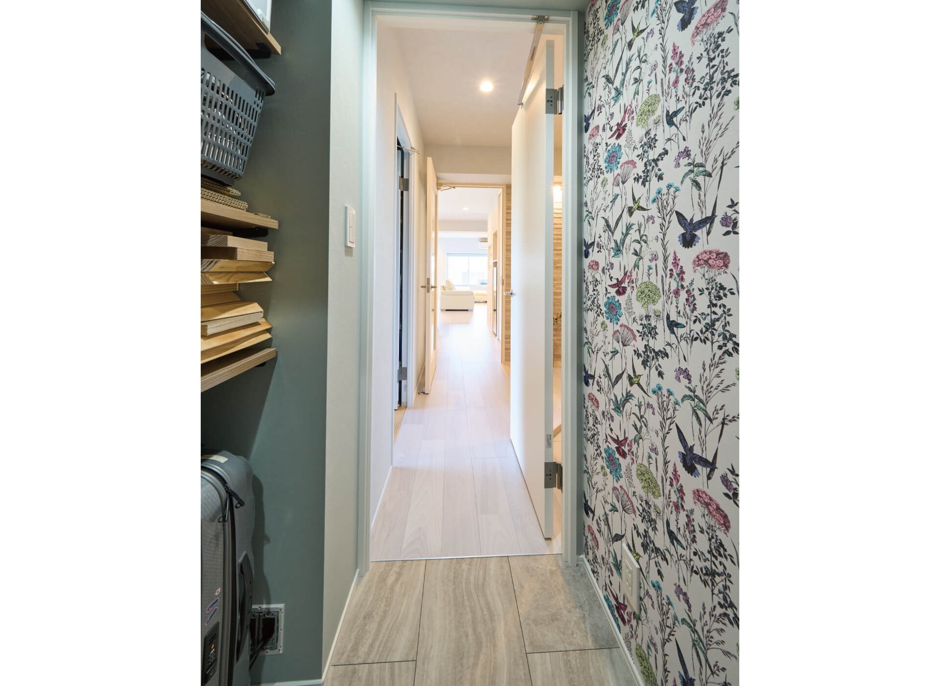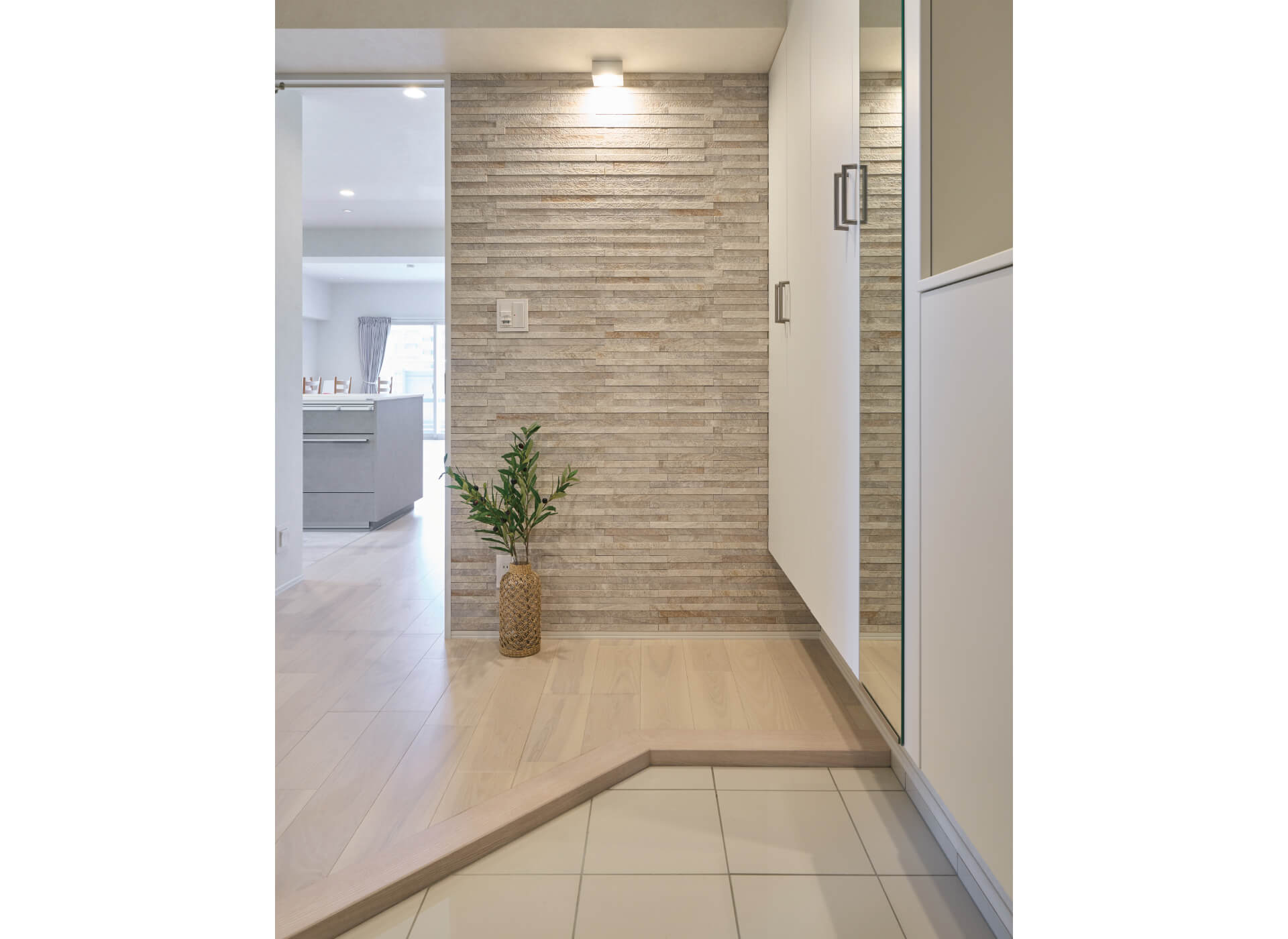 玄関扉を開けると、正面には美しいタイルの壁。ゲストが一度に大勢いらっしゃっても混雑しないスペースを確保。