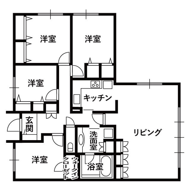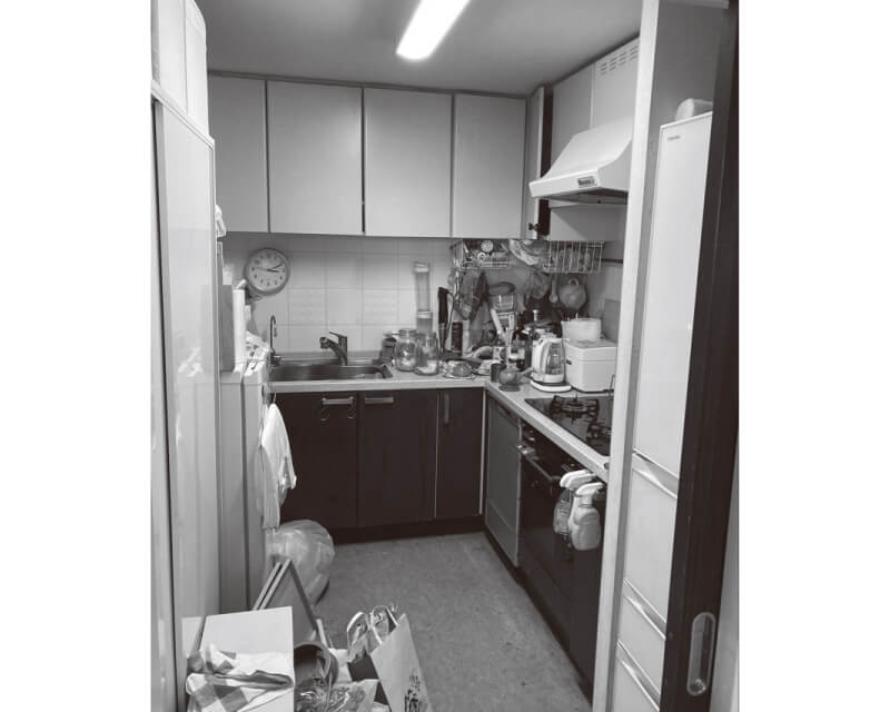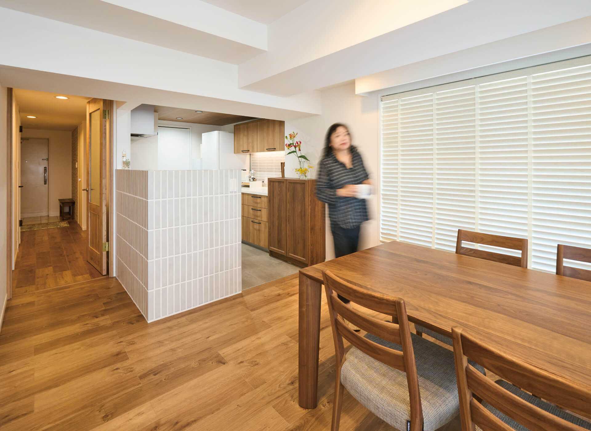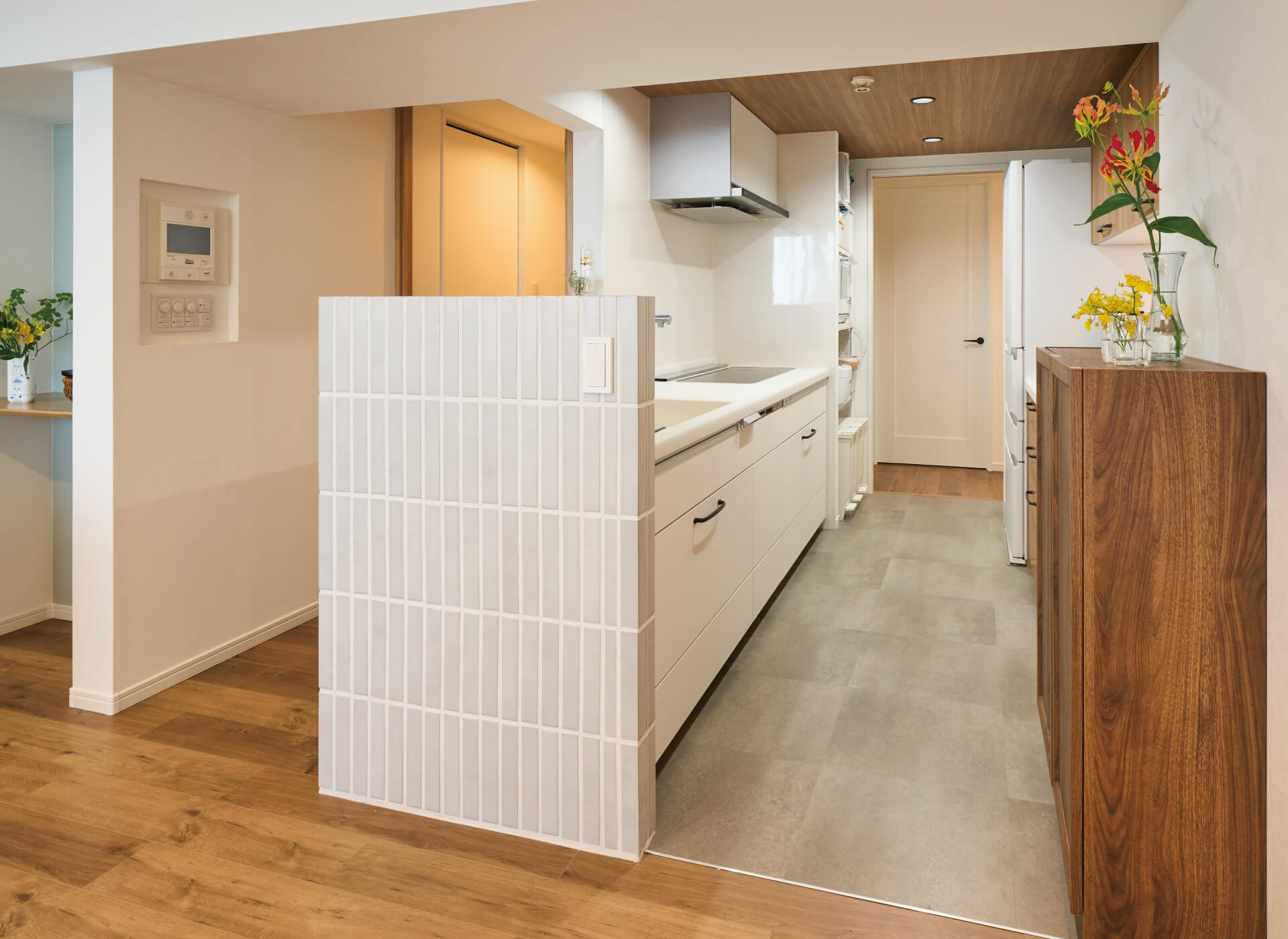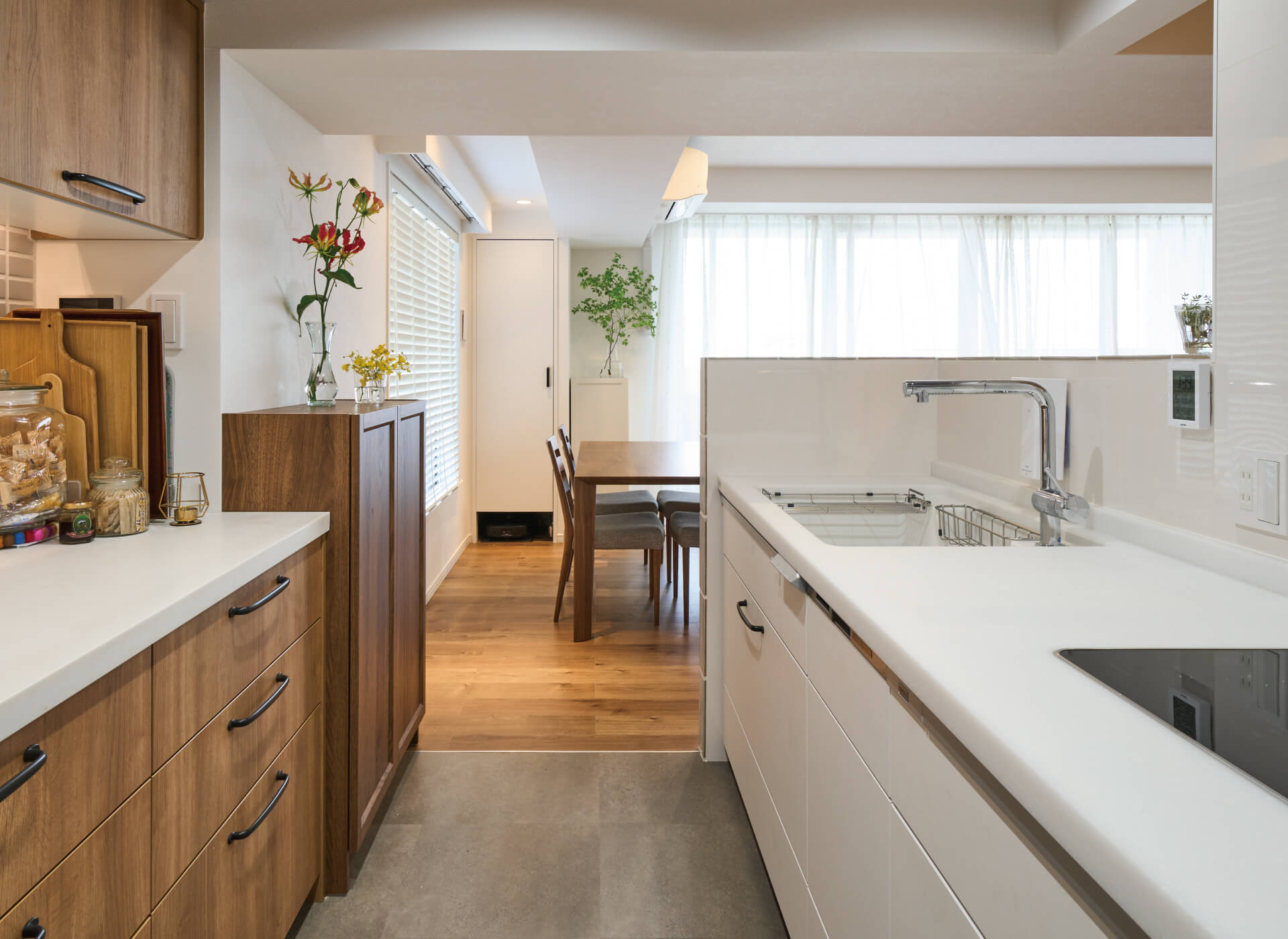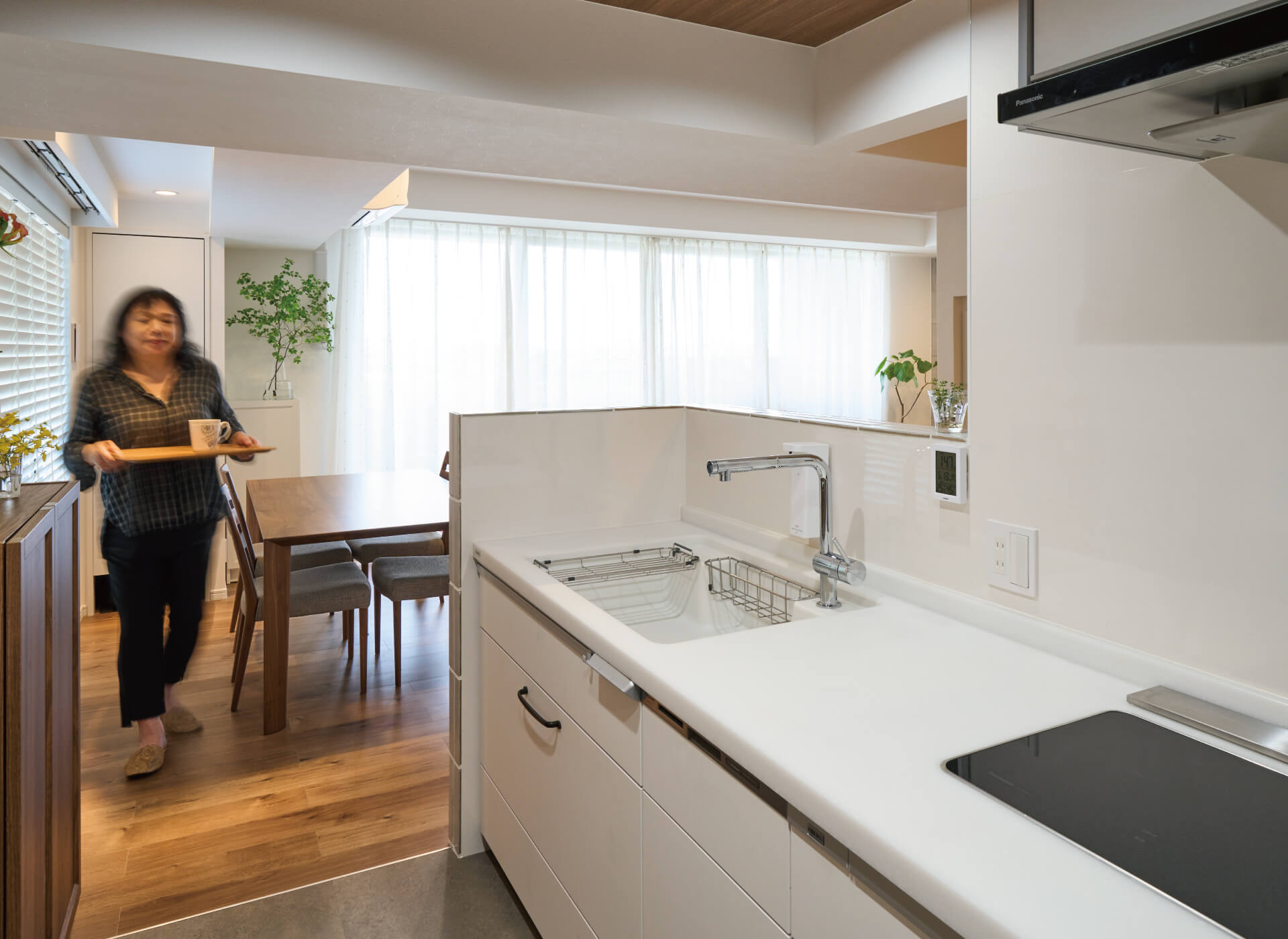 クローズドで閉鎖感のあるキッチンを、リビングとの壁を取り払って明るいセミオープンタイプに変更。さらにキッチン位置をリビング側にオフセットして配置し、リビングとの一体感を生み出しました。