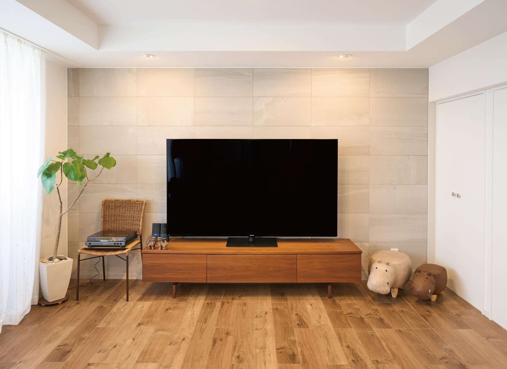 リビングの床にはオーク柄の「ウスイータ」を採用。調湿機能のあるタイルが空間のアクセントとなり奥行きを感じさせます。
