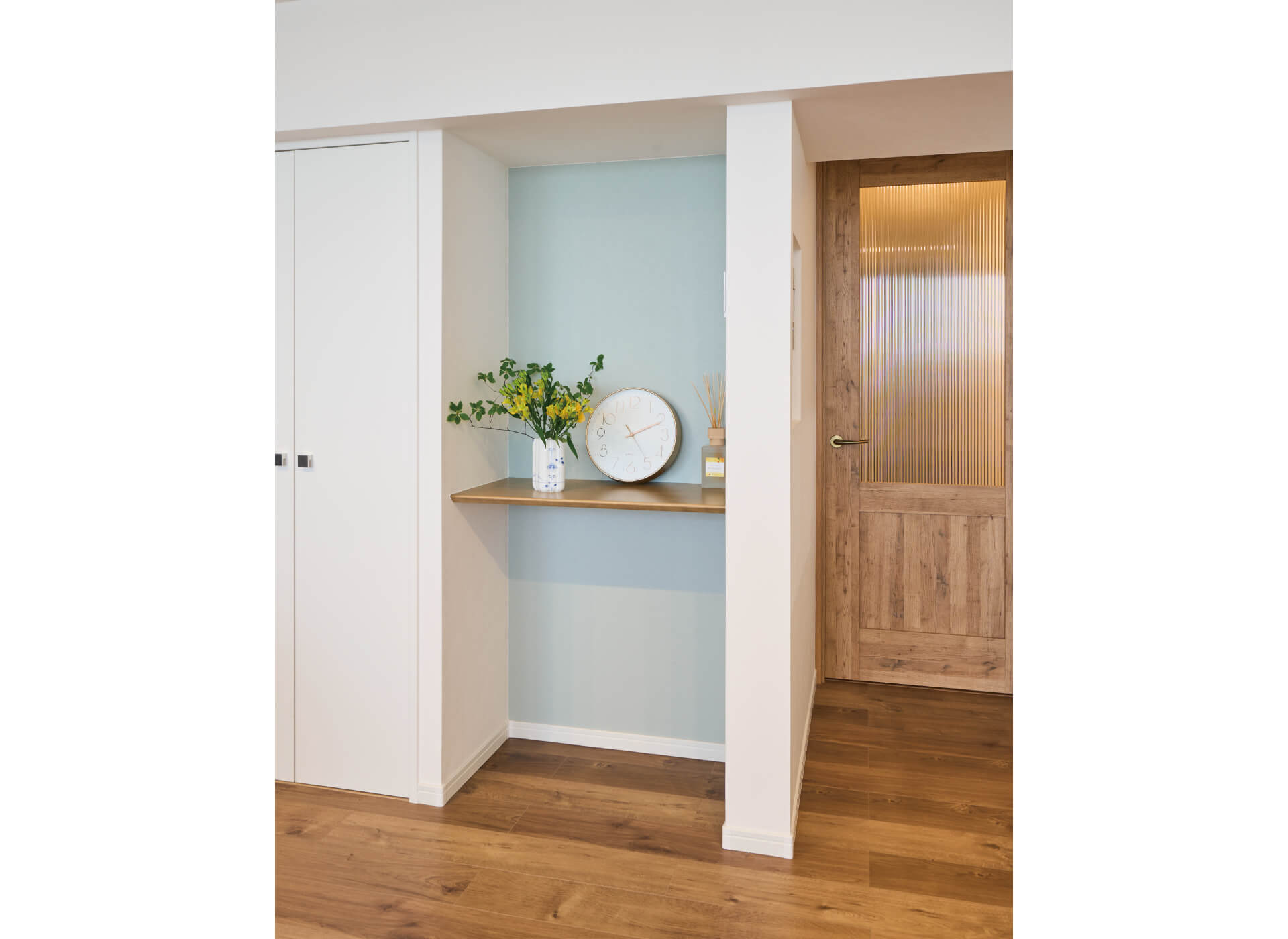 リビングの一角に「インテリアカウンター」で飾り棚を造作しました。内側の壁には爽やかなブルーを選んでいます。