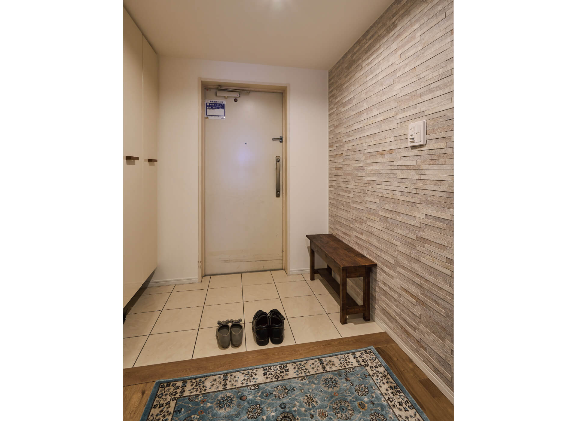 玄関ホールの壁面にも、調湿機能のあるタイルを張りました。湿気対策だけでなく、タイル表面のテクスチャーが印象的な空間をつくりだしています。