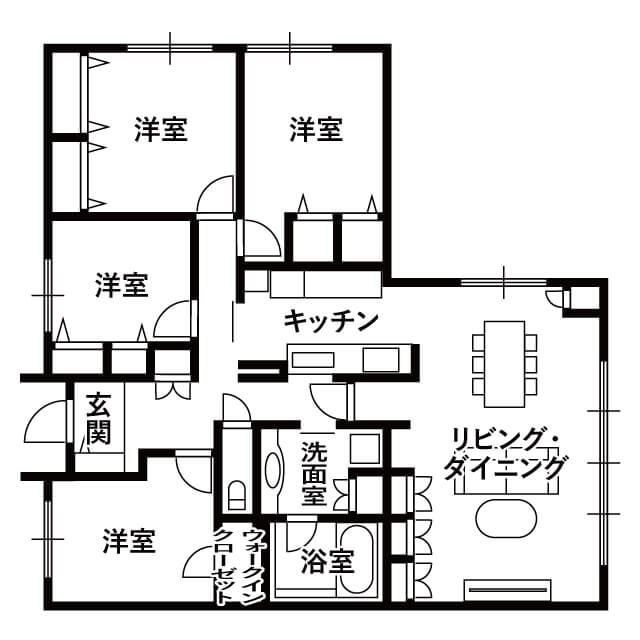 家の真ん中にある独立キッチンをLDKと一体化させ各個室とつなぐ動線を確保することで、ご家族みなさんの暮らしやすさを大きく向上させました。