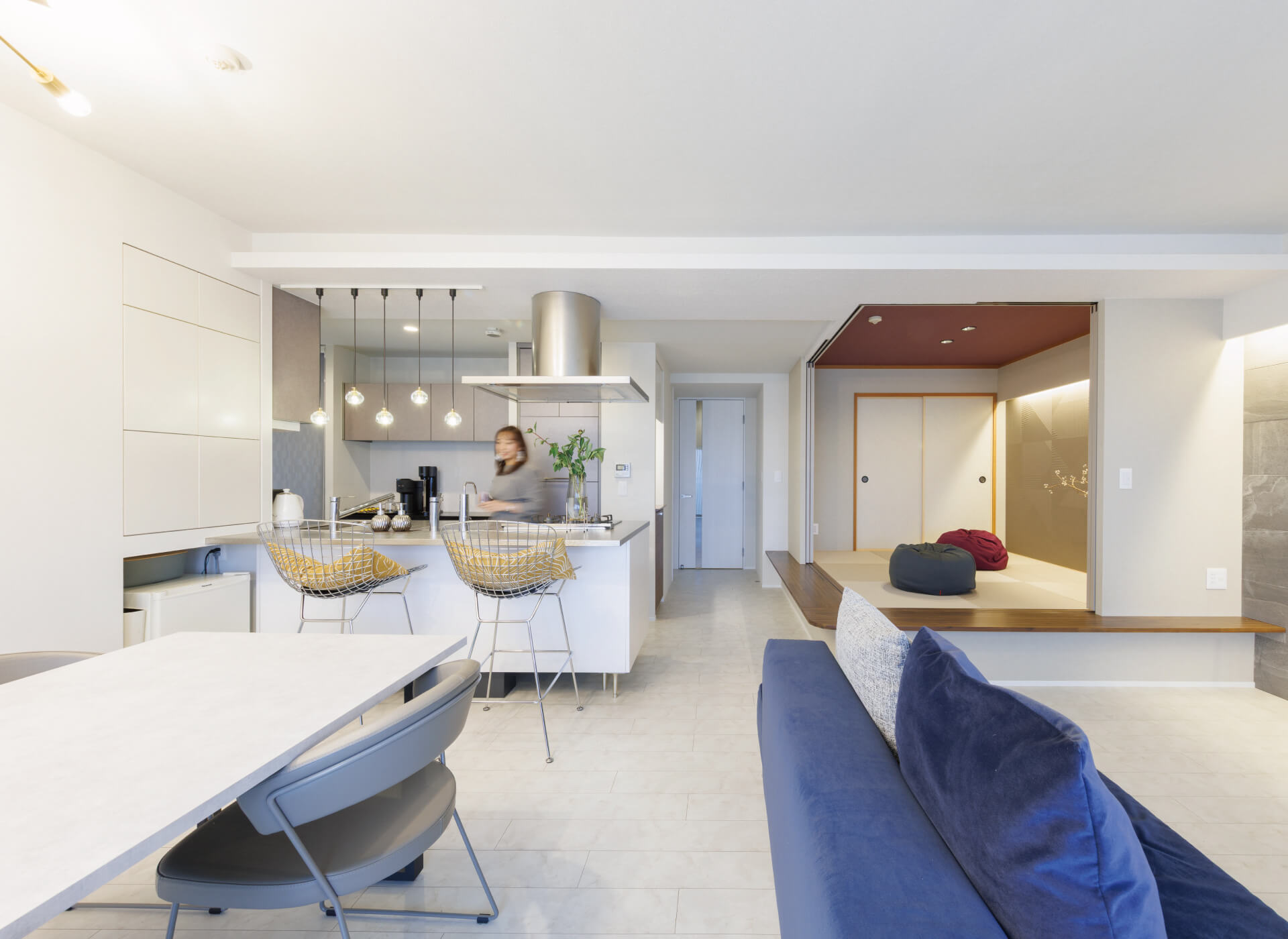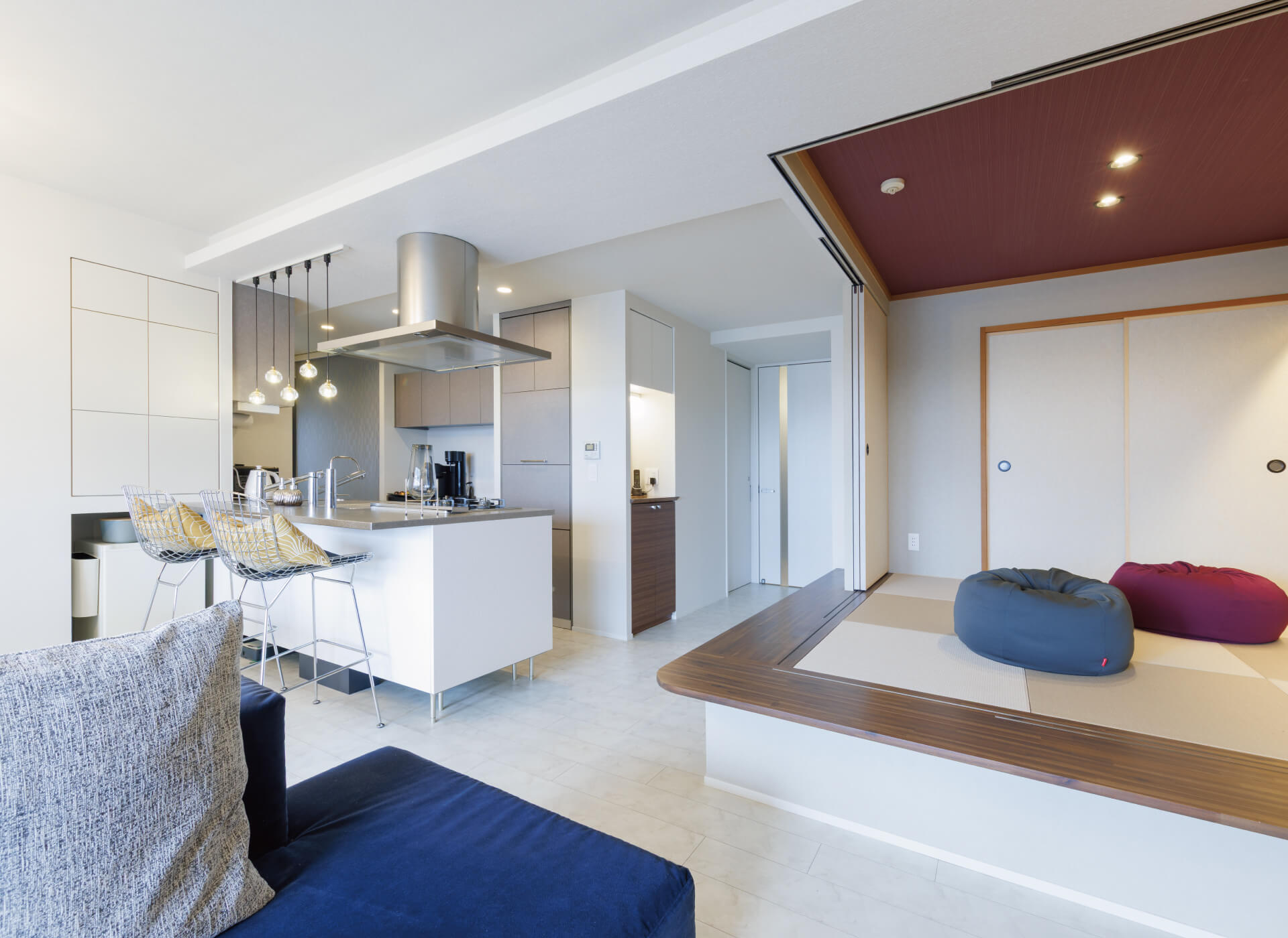 築17年のマンションをリフォームされたS様。独立したキッチンをオープンスタイルにして、隣接の和室を6畳から約4.5畳の小上がりの畳コーナーにして、広く開放的なLDKに生まれ変わりました。ひとりの時間を楽しめる空間も確保しつつ、家族みんながくつろげる住まいになりました。