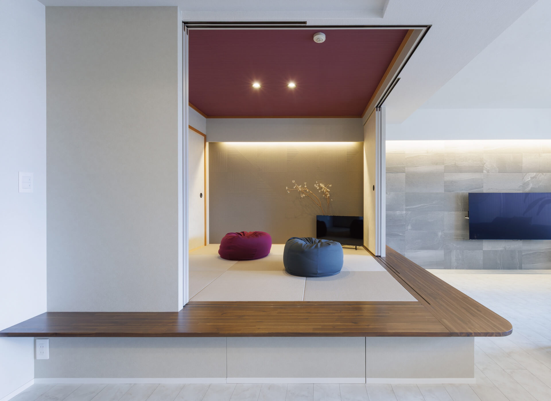 リビングの一角の和室は、間接照明で落ち着いた雰囲気を演出。引き戸を閉めると「こもれる空間」に。小上がりの畳の下は収納スペースとなっています。
