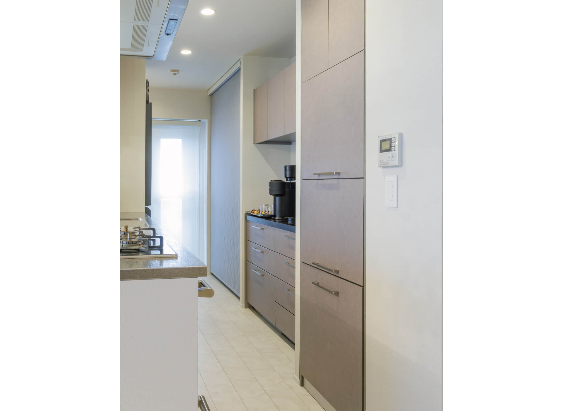 洗面室への出入口に壁をつくり、カップボードを新設。手前には調理家電を納めるスペース、奥には可動棚のパントリーを設け、収納を充実させました。
