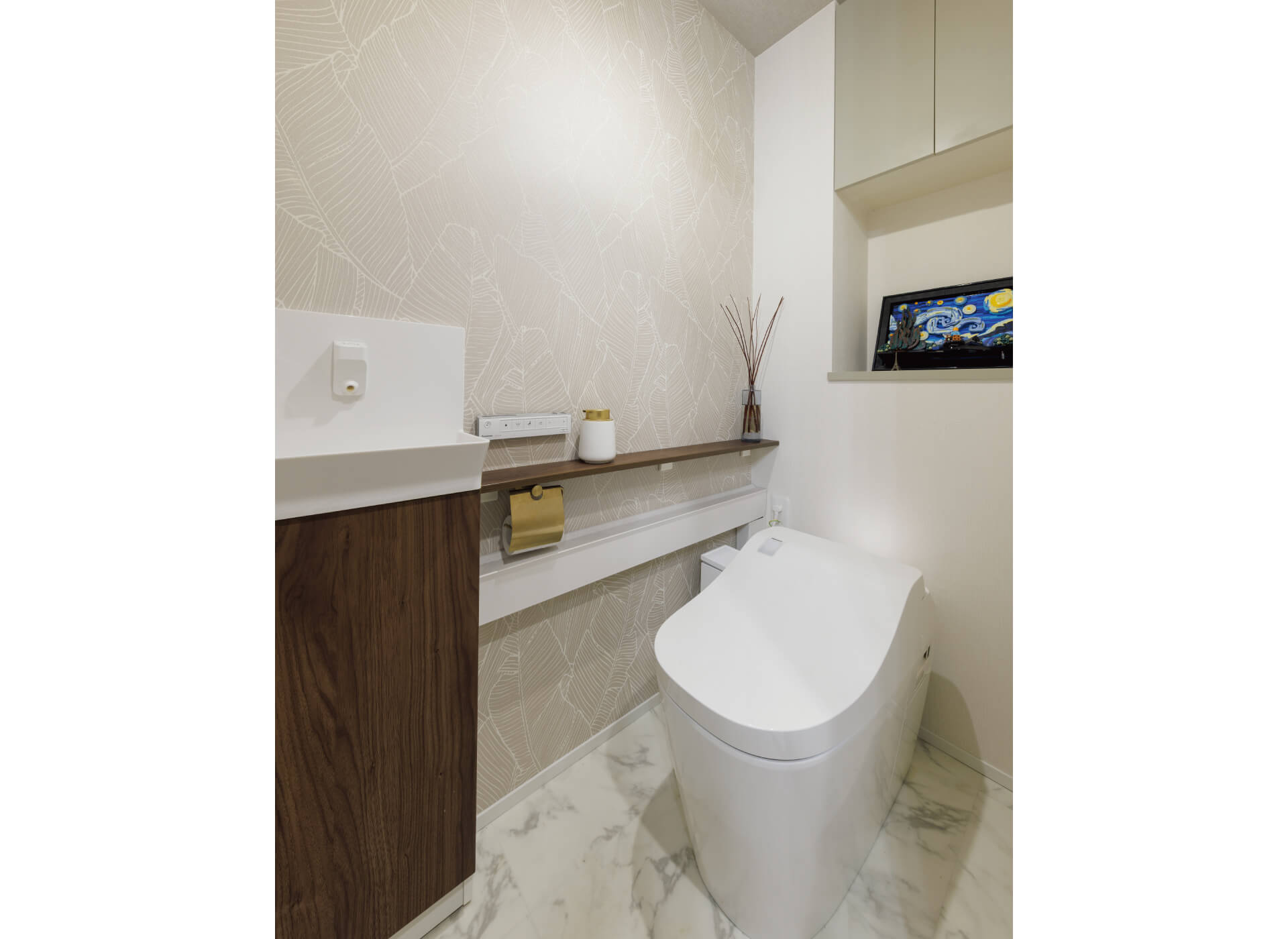 トイレはアラウーノを採用し、スマートな手洗いを設置して清潔感のある快適な空間に。奥様お気に入りの照明やアクセサリーで華やかさをプラスしました。