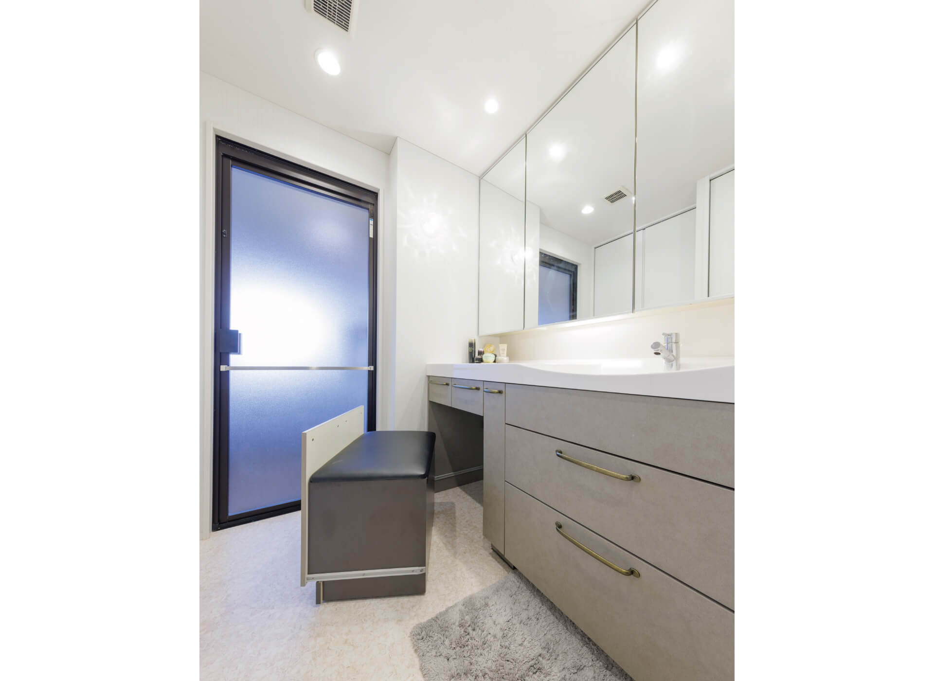 1.5m幅のゆったりとした洗面化粧台とブラケット照明で、ラグジュアリーな雰囲気に。スツールワゴンに腰かけて、ゆったりと身支度ができます。
