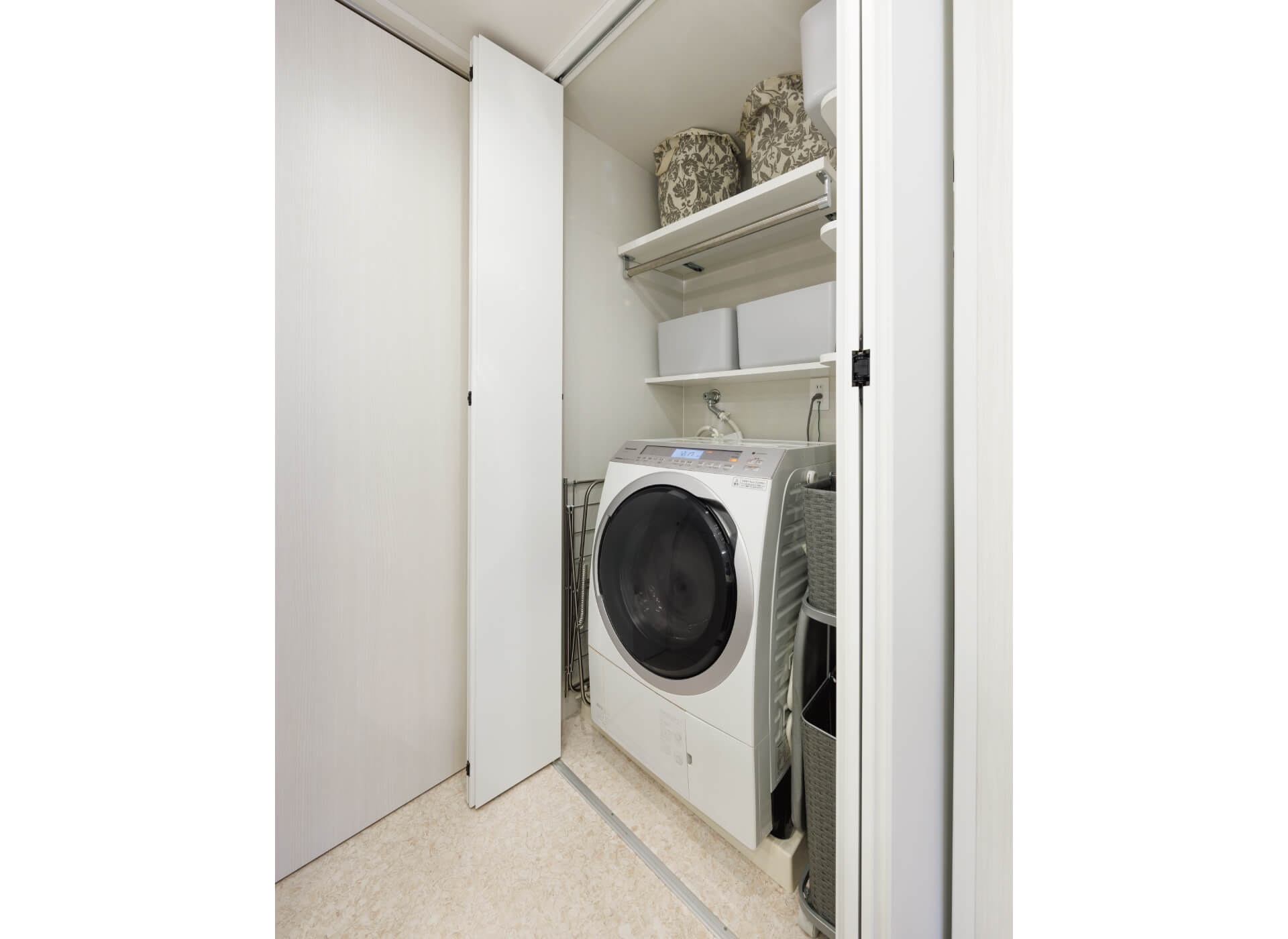 洗面室内に、洗濯機や洗剤・洗濯用具などを収納できるランドリースペースを設置。洗濯機を使わないときは、折れ戸を閉めてすっきり隠せます。