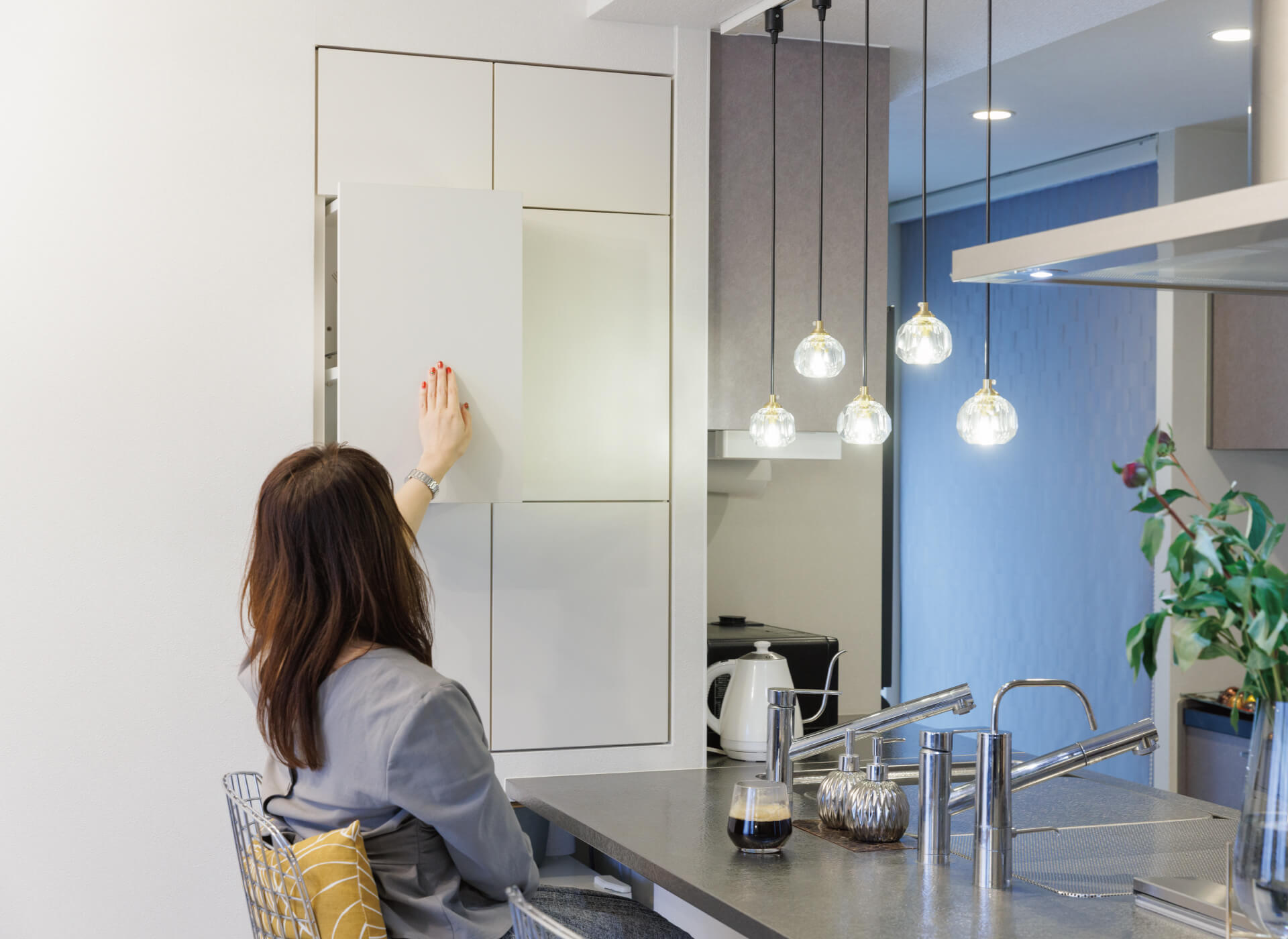 キッチンのダイニング側のカウンターで、カフェやバーにいるかのように、夫婦の時間を楽しんでいます。カウンター横の壁面収納はプッシュラッチ式で、生活雑貨を隠してしまえるので、リビングをいつもきれいに保つことができて嬉しいですね。