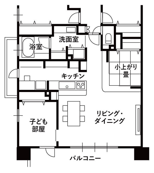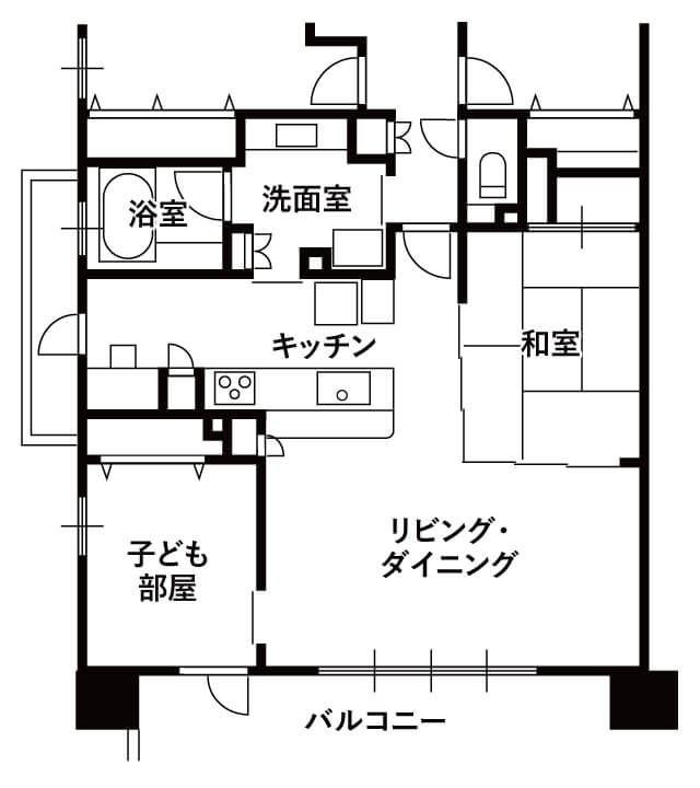 洗面室の出入口を2カ所から1カ所に減らしても、リビング扉の位置を変更して動線をスムーズに。そのうえキッチン側と洗面側ともに効率よく収納スペースを確保しました。