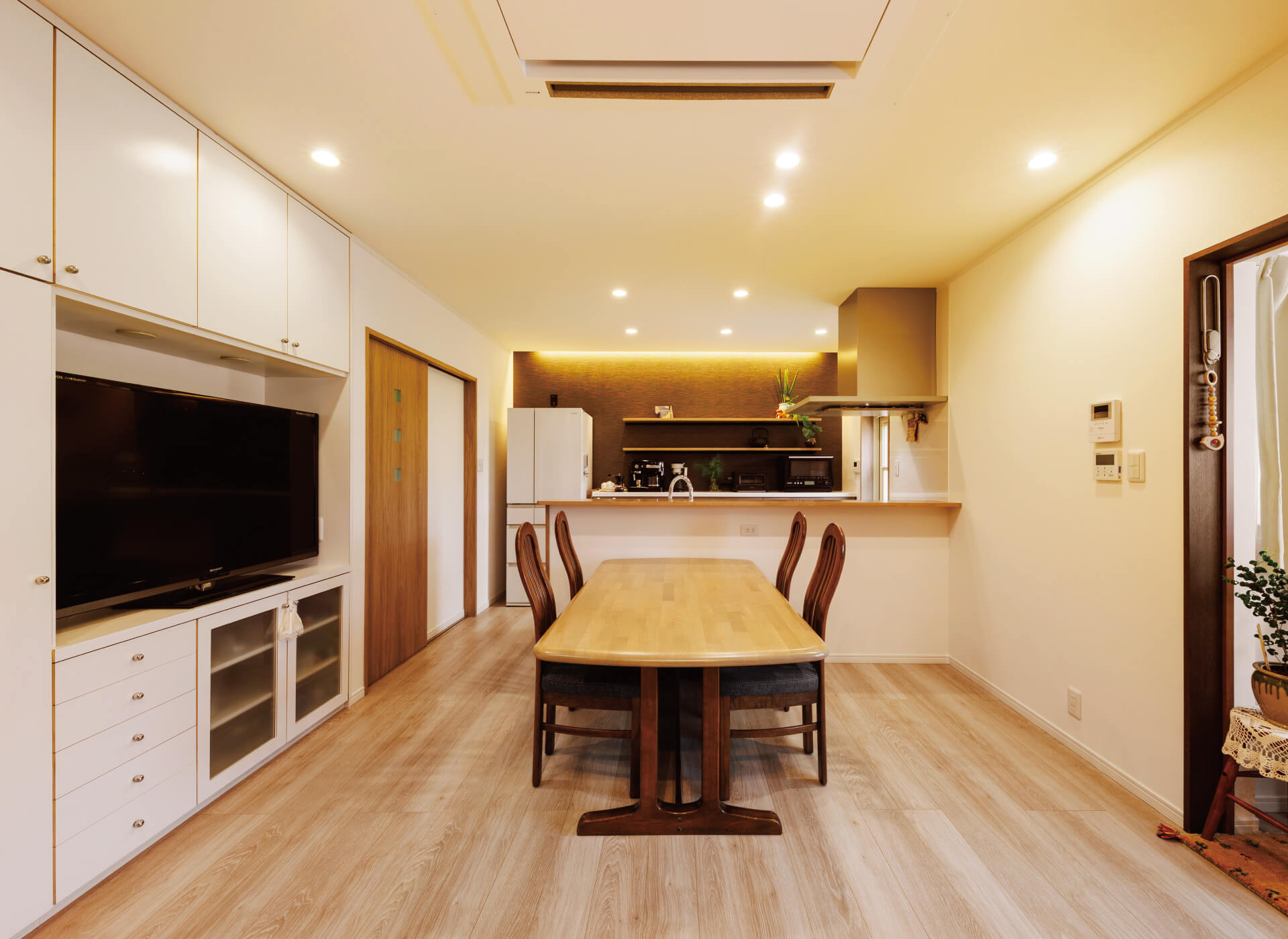 洗面台のリニューアルをきっかけに、家事上手な奥様へのプレゼントとして、使いやすく上質感のある水廻りに一新。夫婦ふたりの生活スタイルに合わせて、LDKや玄関にもゆとりを持たせ、居心地よい住まいへと生まれ変わりました。