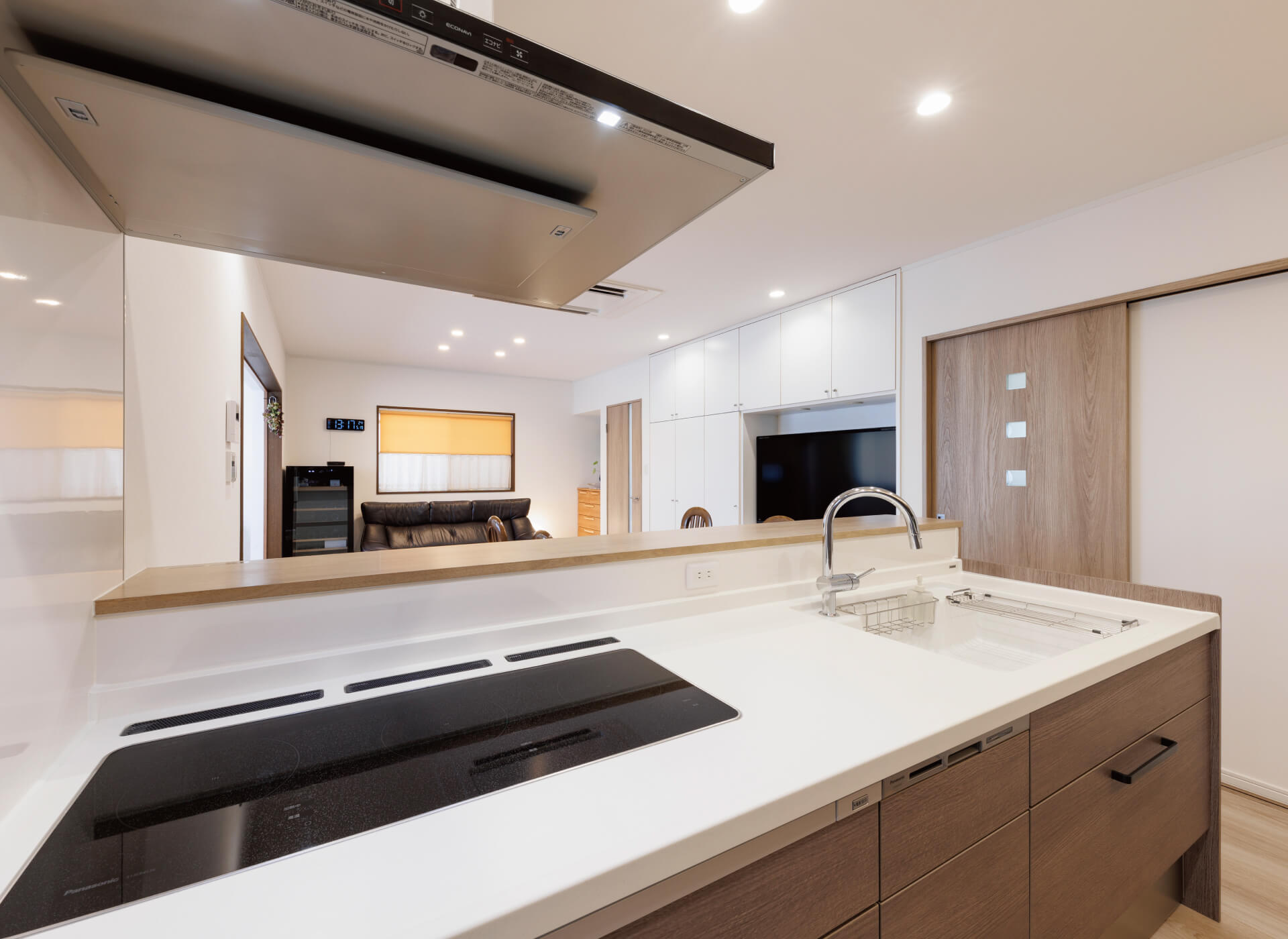 天袋をなくして、見通しがよくなったキッチン。ご夫婦が並んで一緒に使えるトリプルワイドIHを採用しました。