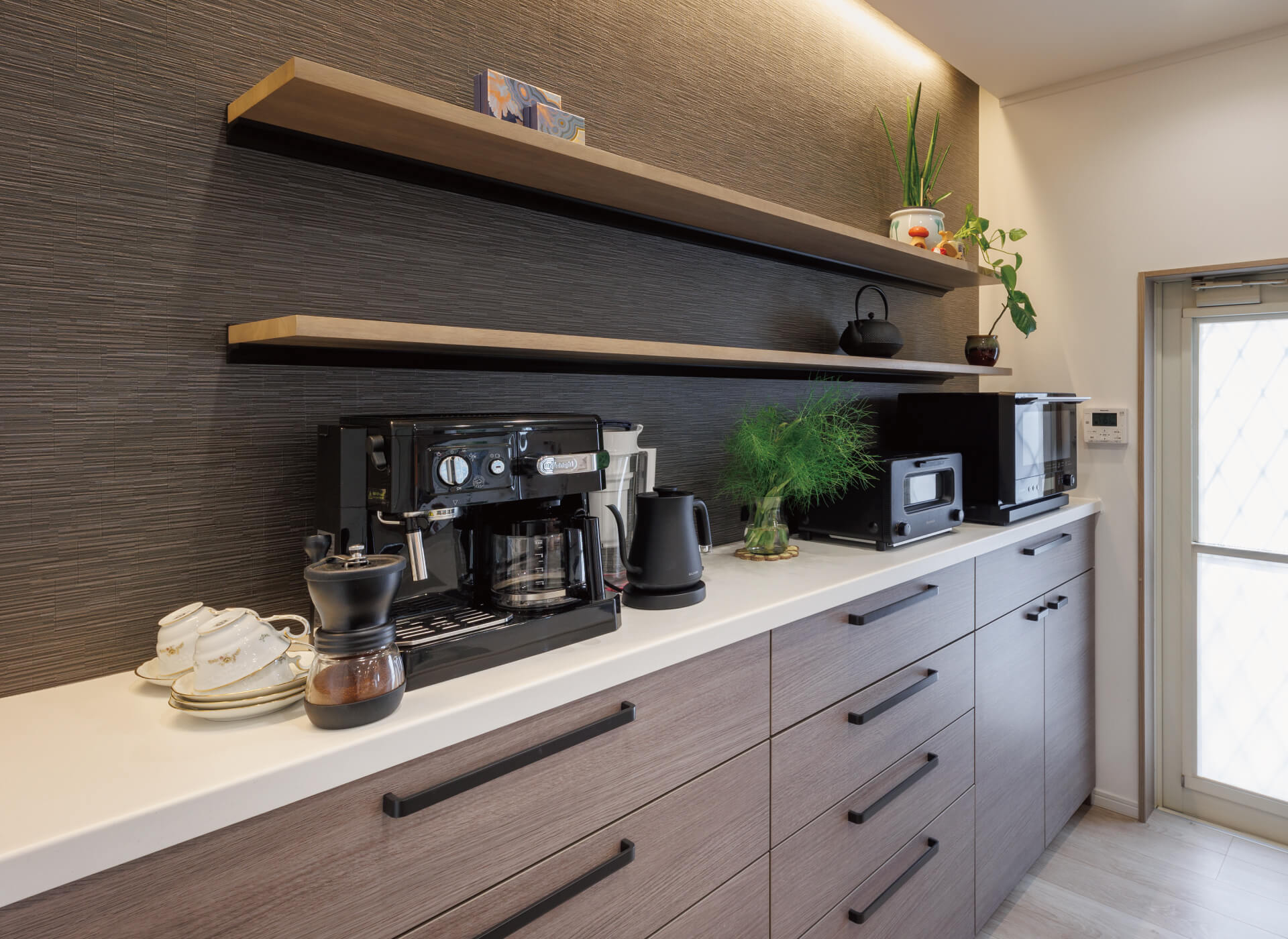 出し入れしやすい引き出し収納のカップボードの上には、調理家電をならべて使い勝手よく。間接照明がアクセント壁を照らして、上質な雰囲気に。