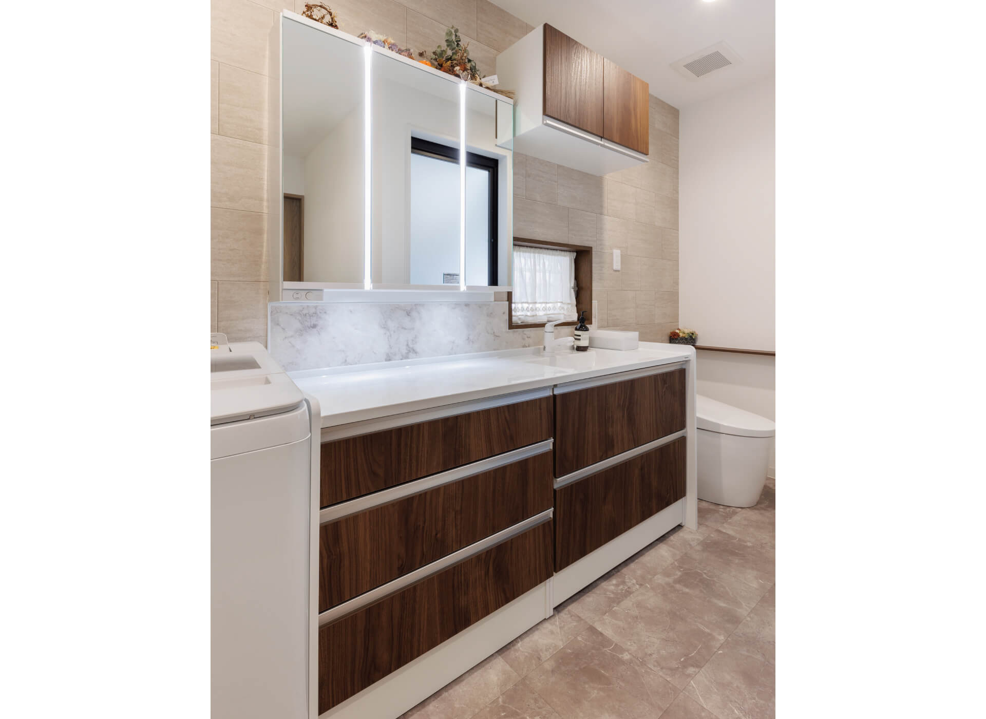 洗面室とトイレを一体化したパウダールーム。機能性と美しさを兼ね備えた洗面ドレッシングは収納量もたっぷり。雑多なものがすっきり片付きます。