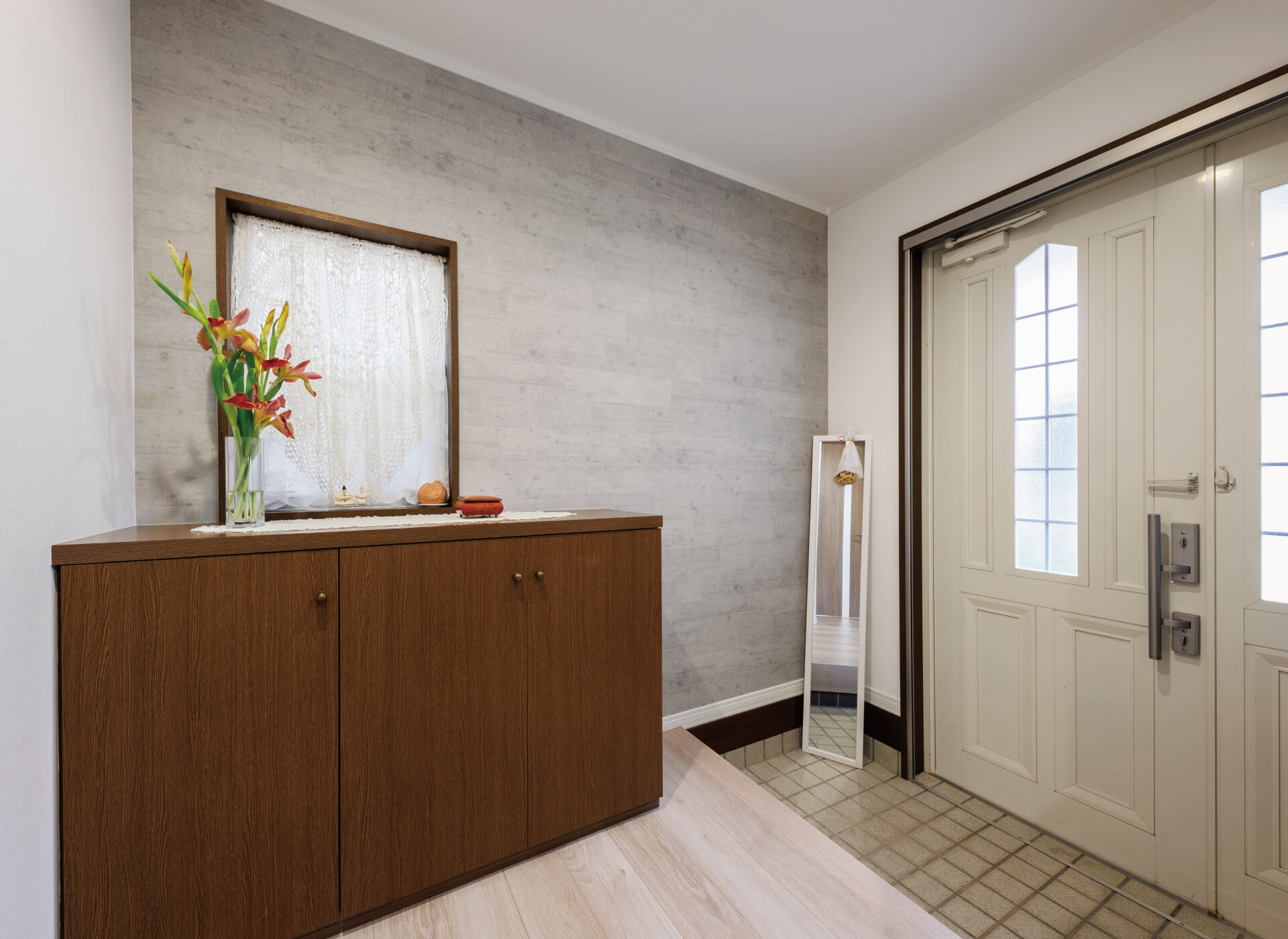生活スタイルの変化に合わせて収納をコンパクトにして、玄関廻りをすっきりと。框を広げて、より開放的で使いやすい空間に。