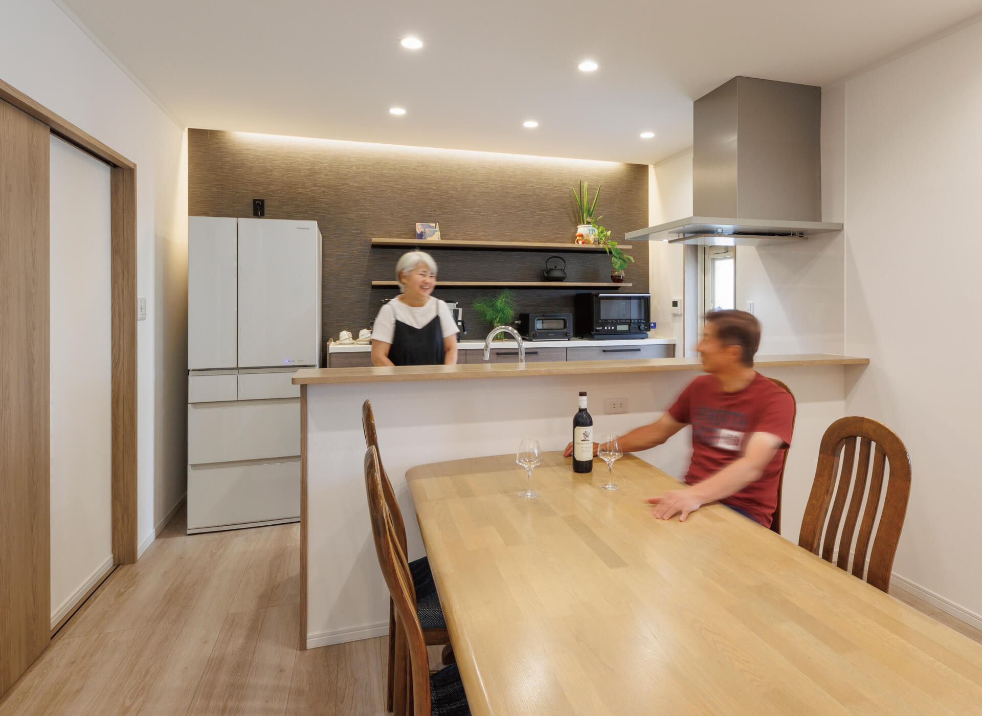 天袋をなくしてリビングとつながり、すっきりと開放的な空間になりました。やさしい光に調整して心地よい雰囲気の中、夫婦でワインを楽しむのが至高のひとときです。住まい全体が綺麗になり、設備も使いやすくなって喜んでいます。