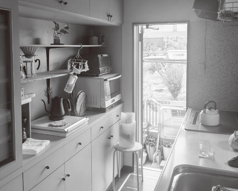 お掃除のしやすさと美しさが決め手となり、「オフローラ」を採用。黒色の窓枠と合わせて、扉やカウンター、水栓も黒色を選んでアクセントに。