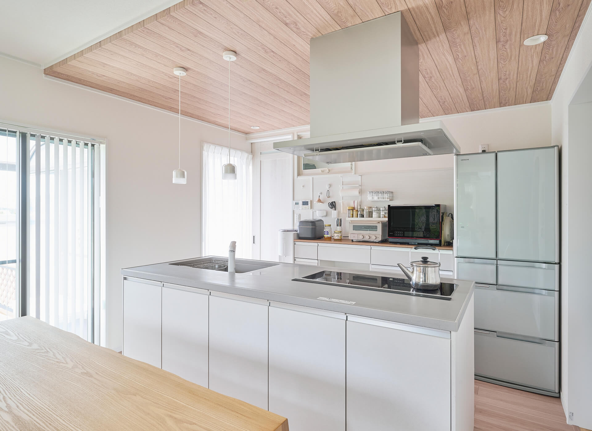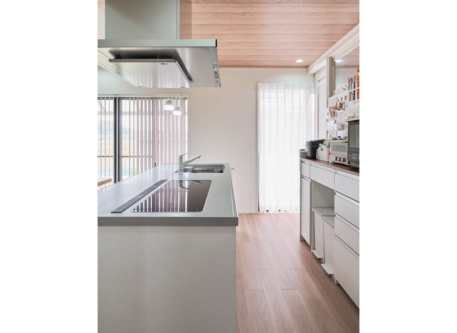 キッチン廻りは天井・床の木目と調和する「アースホワイト」色に。ご家族の歩幅からキッチン間口やカップボードとの間隔を計算し、使い勝手よく仕上げられました。