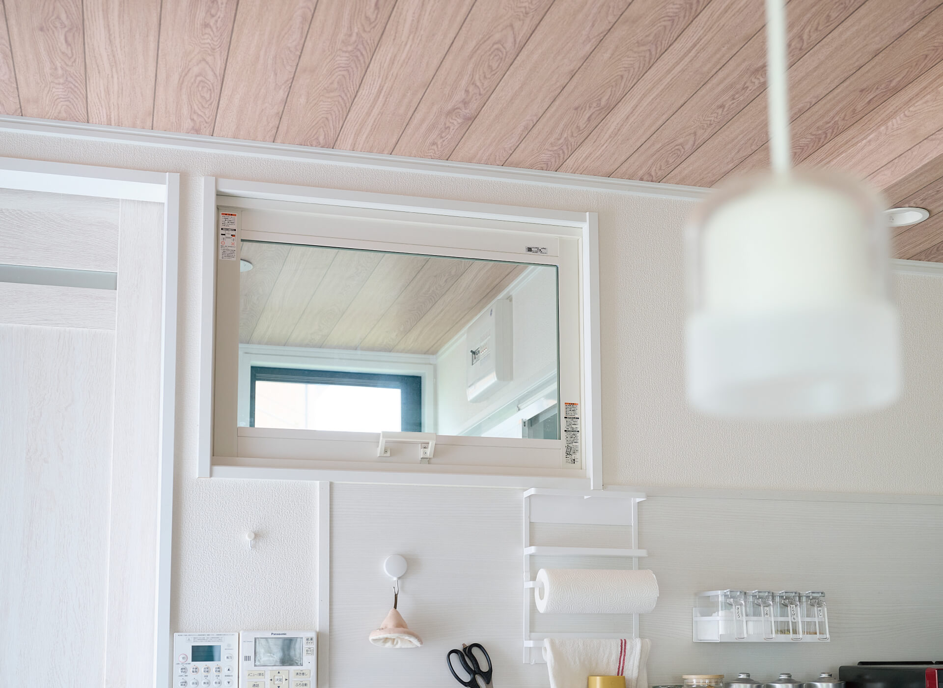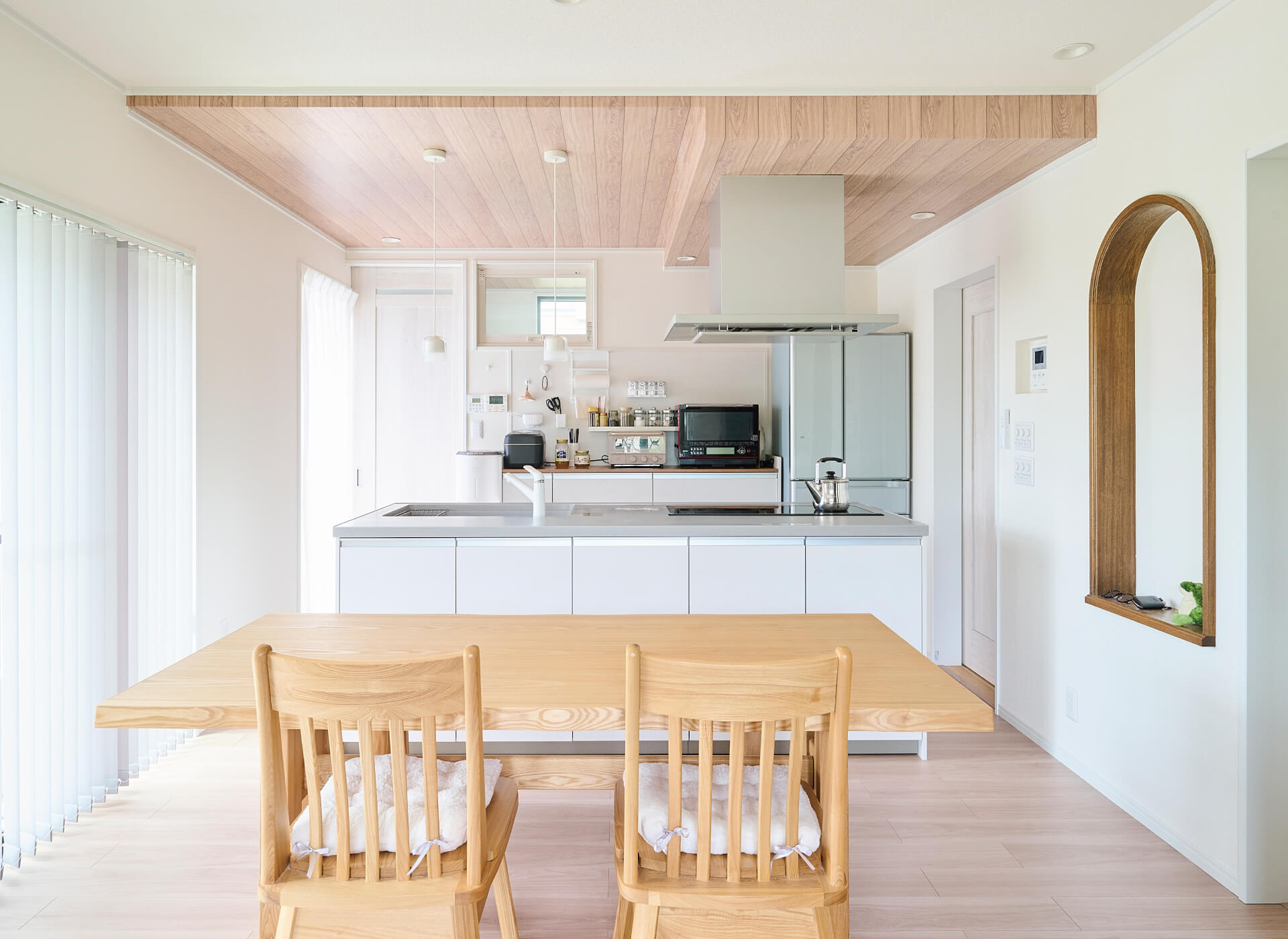 キッチンの天井は木目のクロスに。壁を使わず空間をほどよく区切る工夫です。壁面のアクセントとして再利用したニッチは「好き」をディスプレイできる空間に。