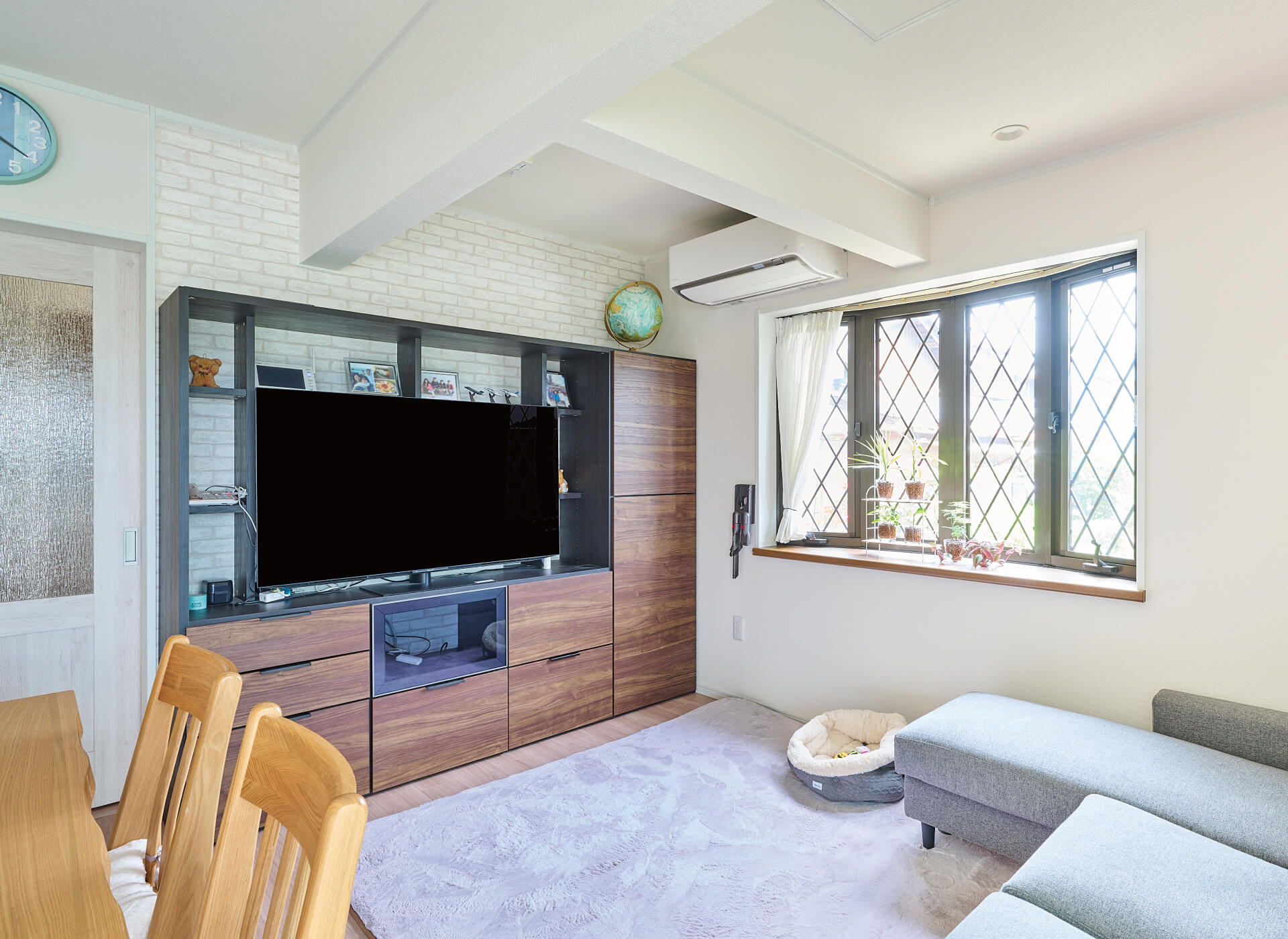 以前は西側にあったリビングとボウウィンドウを東側に移動し、西日の暑さを解消。システム収納の背面はタイル調とし、シンクロ照明によって美しい陰影が浮かび上がります。