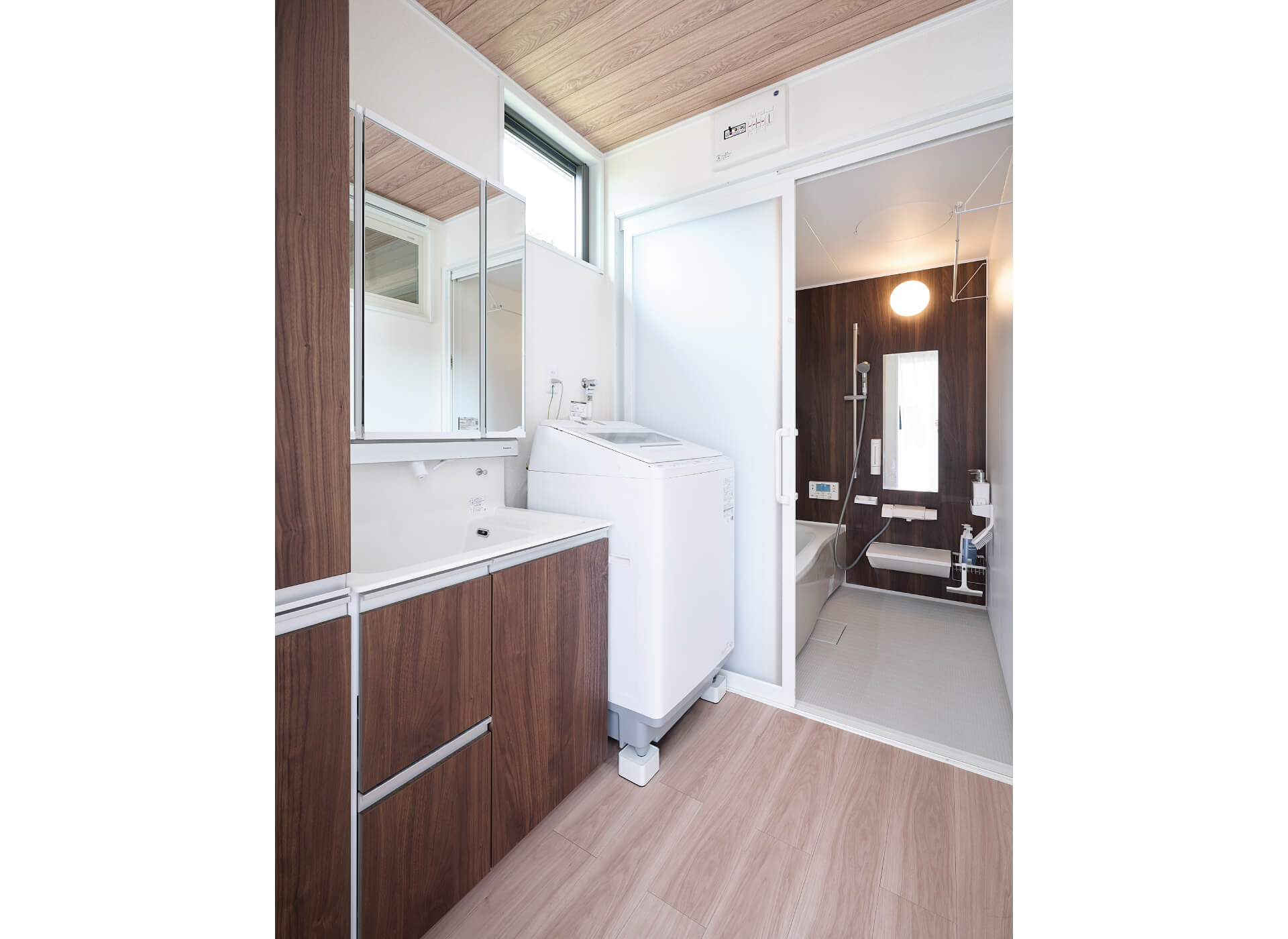 一新した洗面室と浴室はウォールナット色でそろえ、統一感のあるコーディネイトに。高窓から光と風が入る心地よい空間になりました。