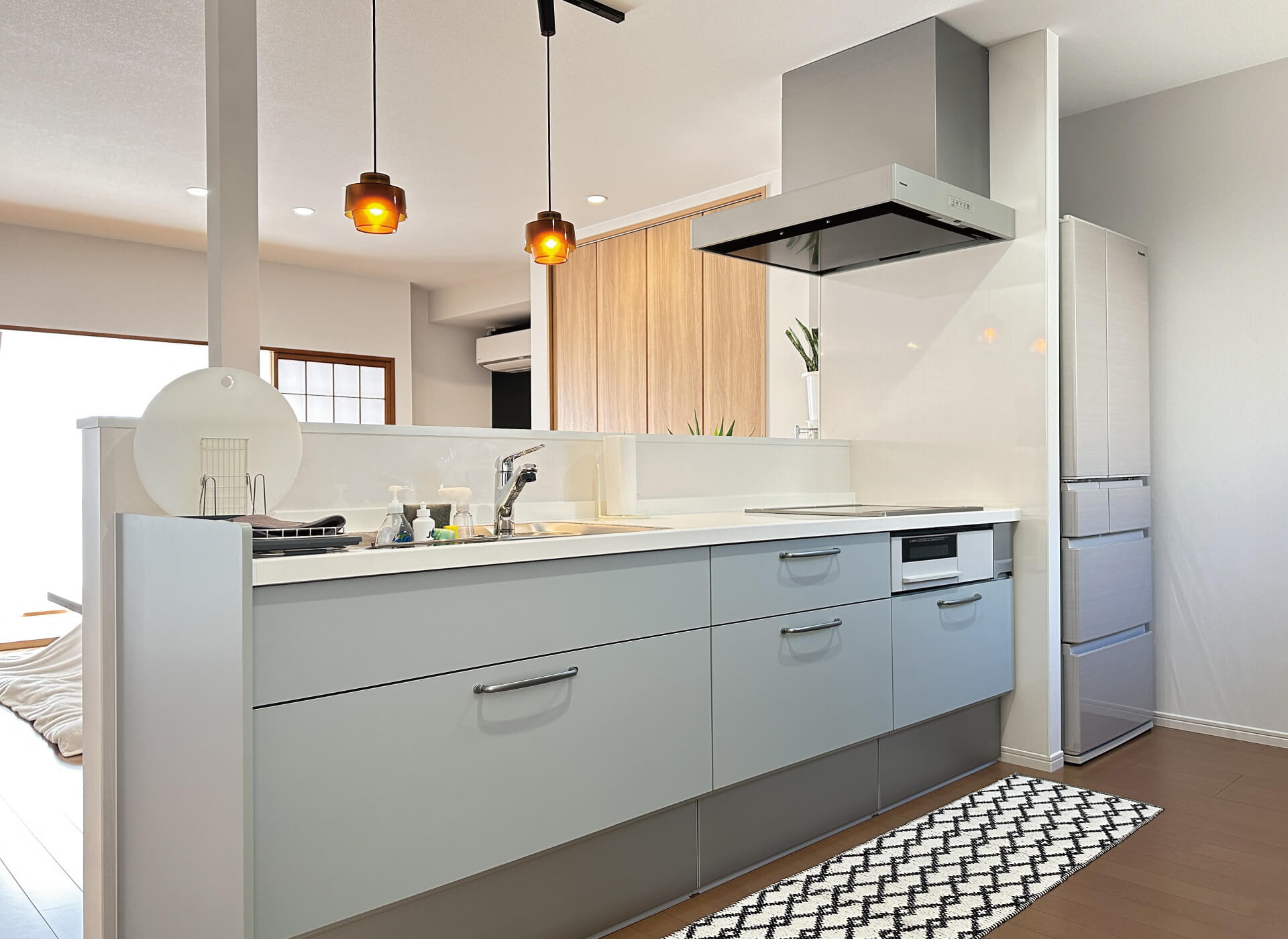 I型のキッチンを対面配置にして開放的に。レトロ感のあるペンダントライトで空間を引き締めます。並べて設置した冷蔵庫がリビングから見えないように壁を造作しました。