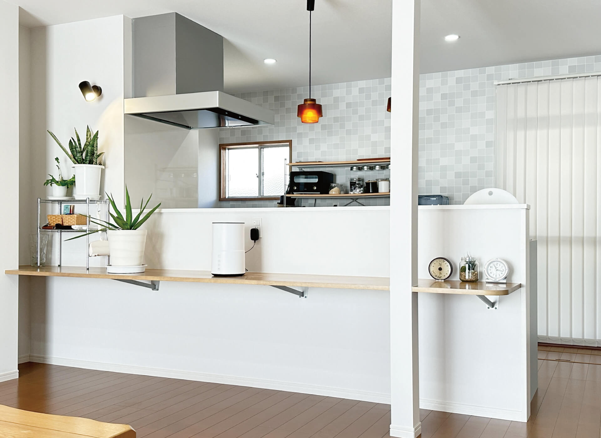 リビングに面した腰壁に、ディスプレイやダイニングテーブルとして使えるカウンターを設置。構造上撤去できない柱を組み込み、存在感を抑えるよう配慮しました。