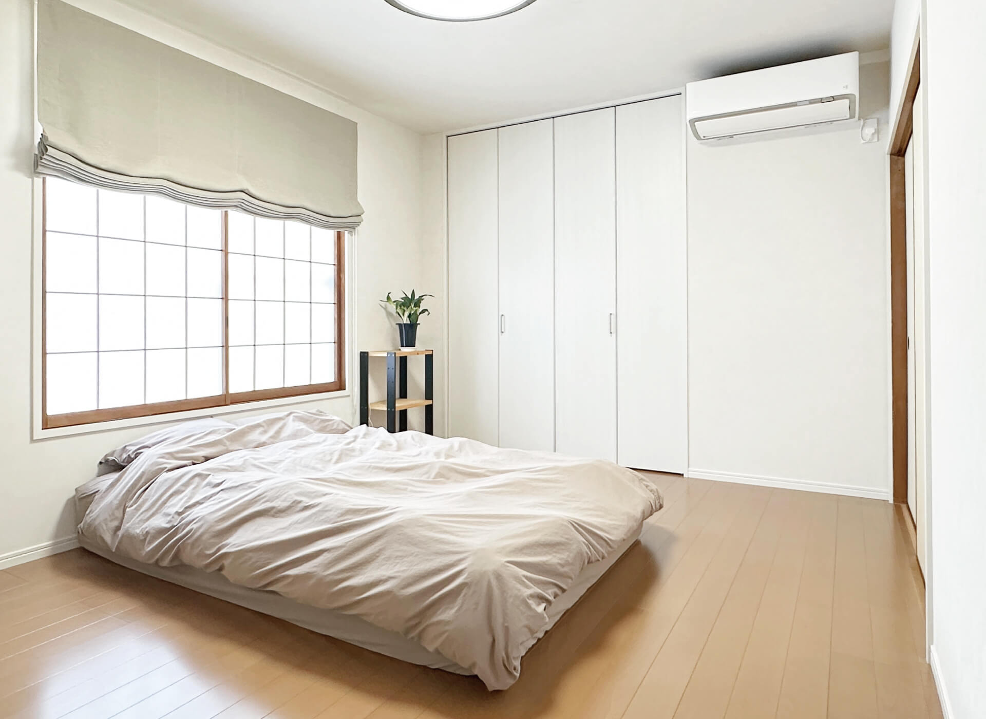 主寝室は、ベッドが使えるように畳をフローリングに変更。遮光性のあるプレーンシェードも設置しました。