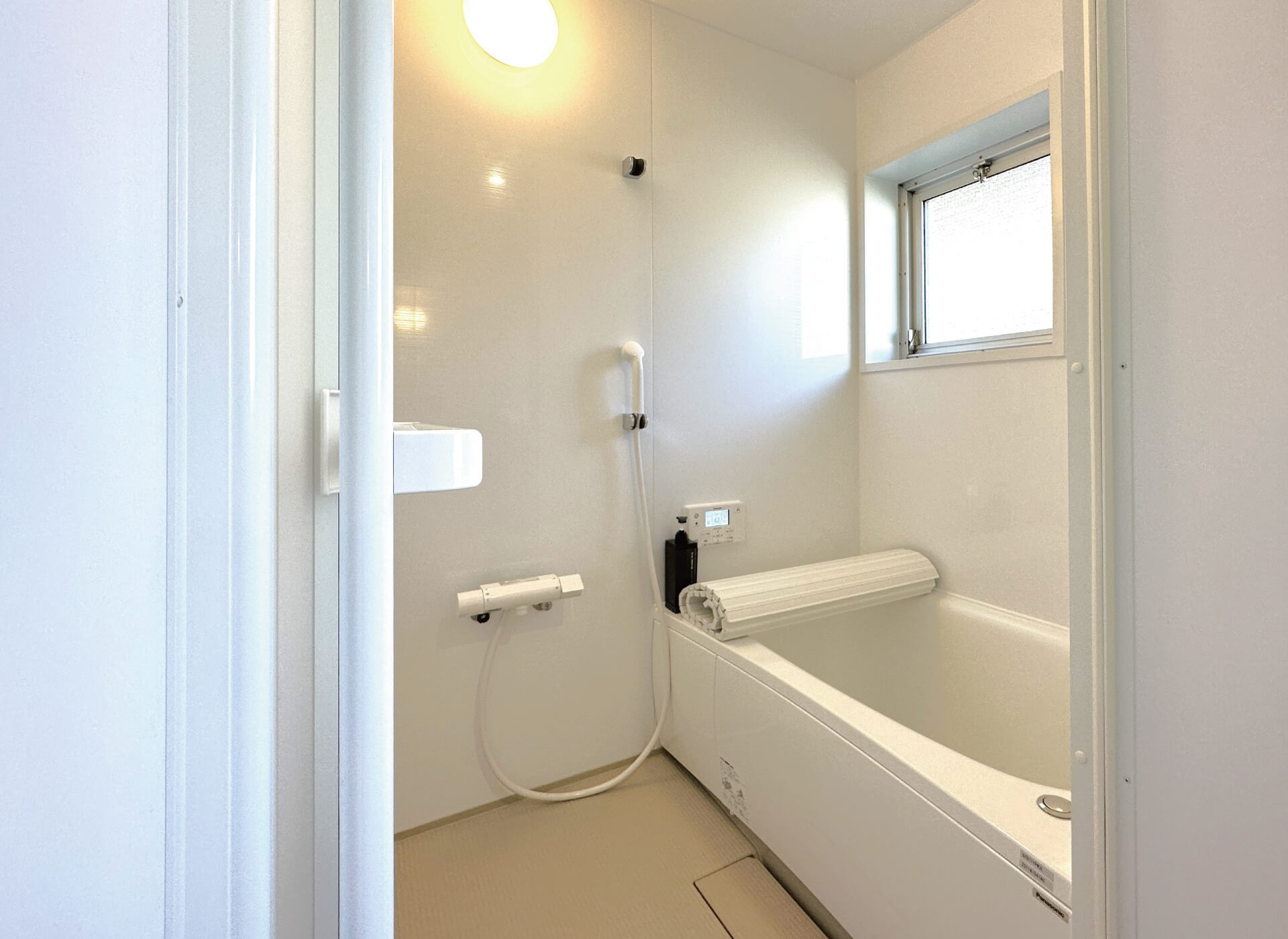 1216サイズの浴室は、壁面をホワイトで統一し、コンパクトながらも狭さを感じにくくしました。