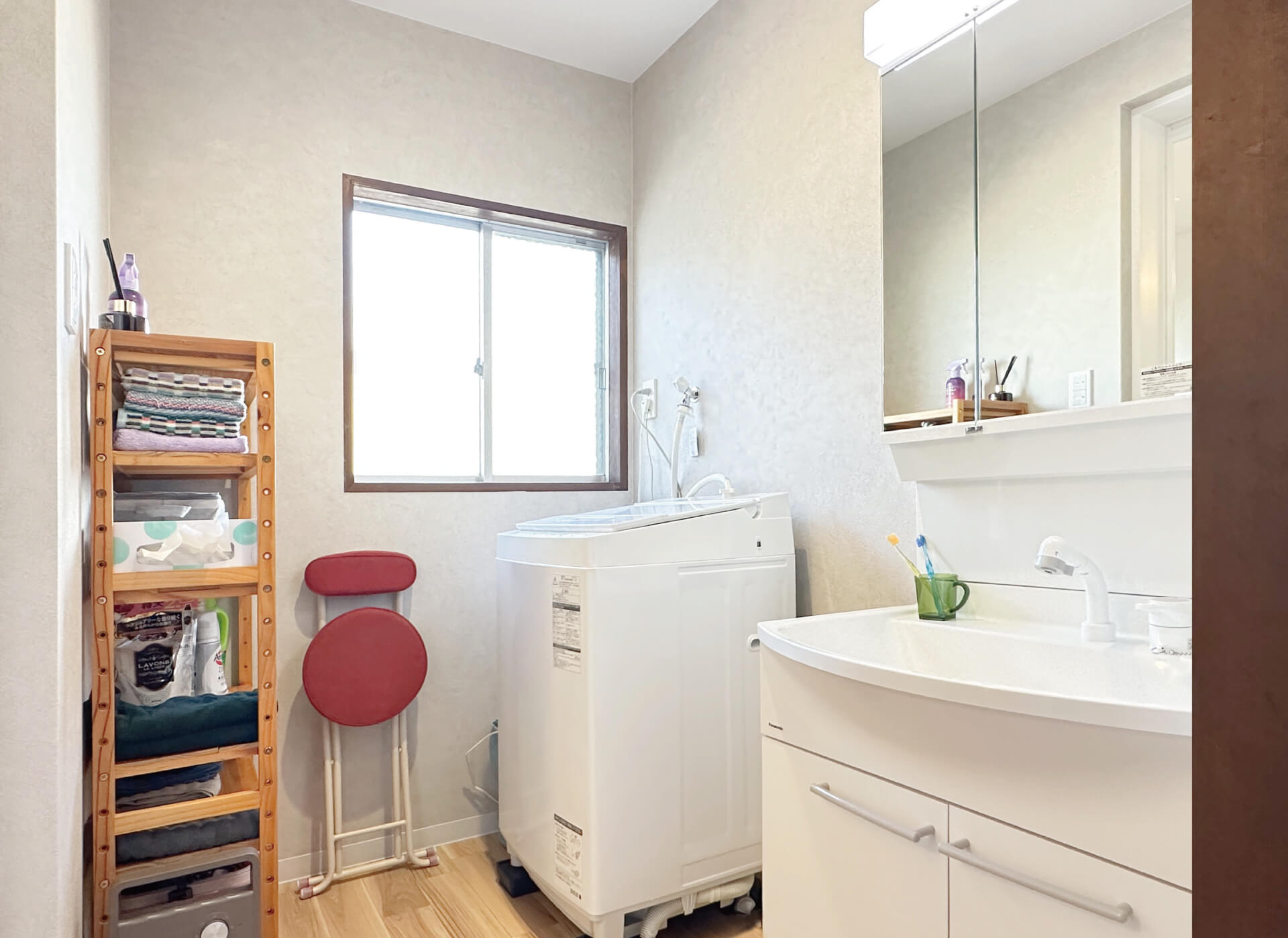 グレーのクロスを貼り、ナチュラルな木目調の床でコーディネイトした洗面脱衣室。白でそろえた洗面化粧台と洗濯機が空間になじみます。