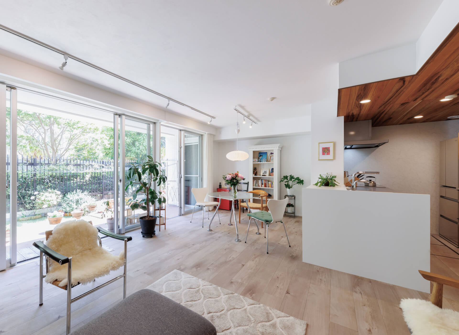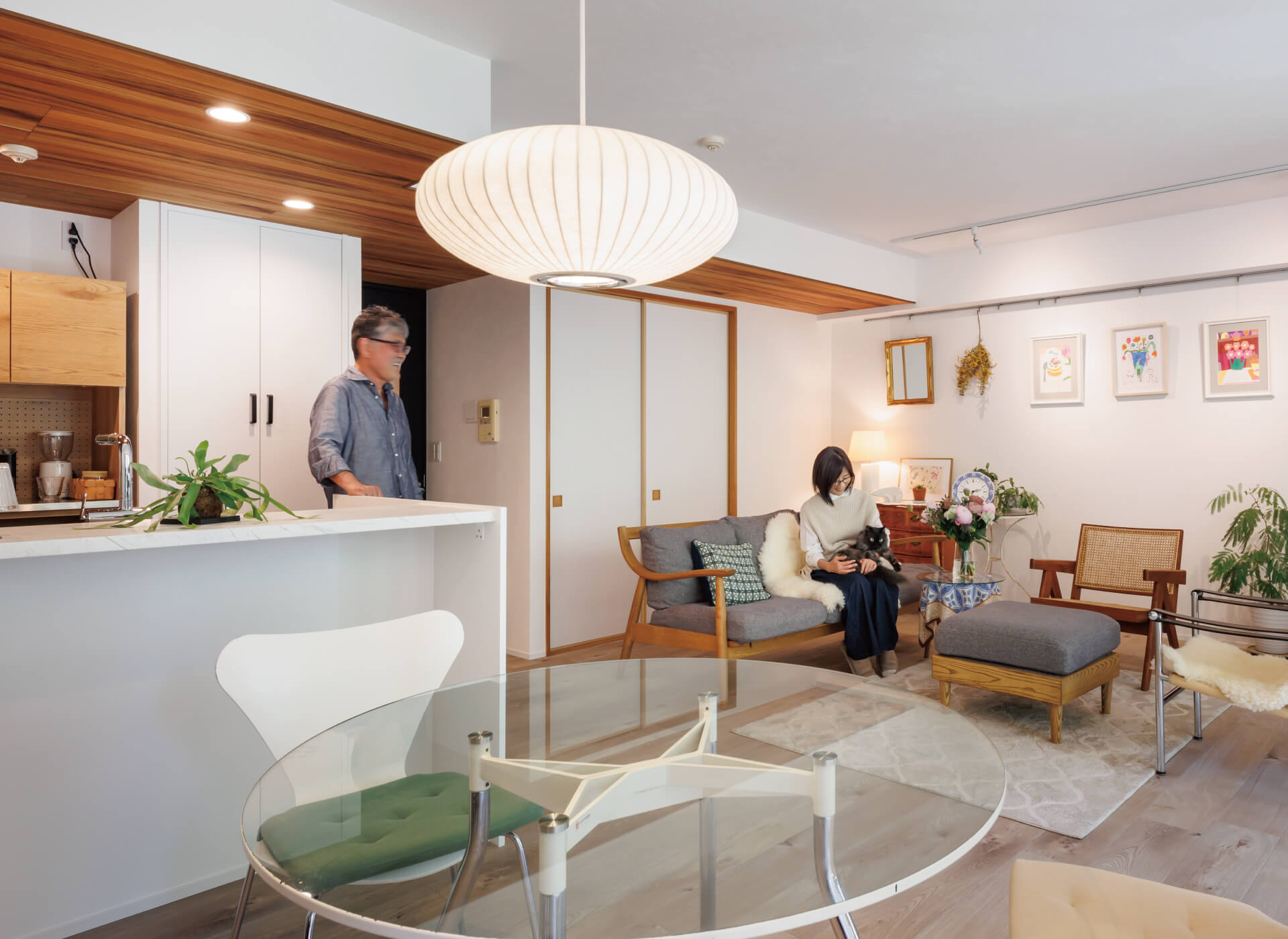 Y様夫婦と猫がのびのびと暮らせるように、水廻りの刷新を機に住まい全体をリフォーム。リビングと隣接する個室をつなげ、大きな窓から光が差し込む広々としたLDKに。アカシアの下がり天井がアクセントとなり、あたたかみのあるスタイリッシュな空間に仕上がりました。