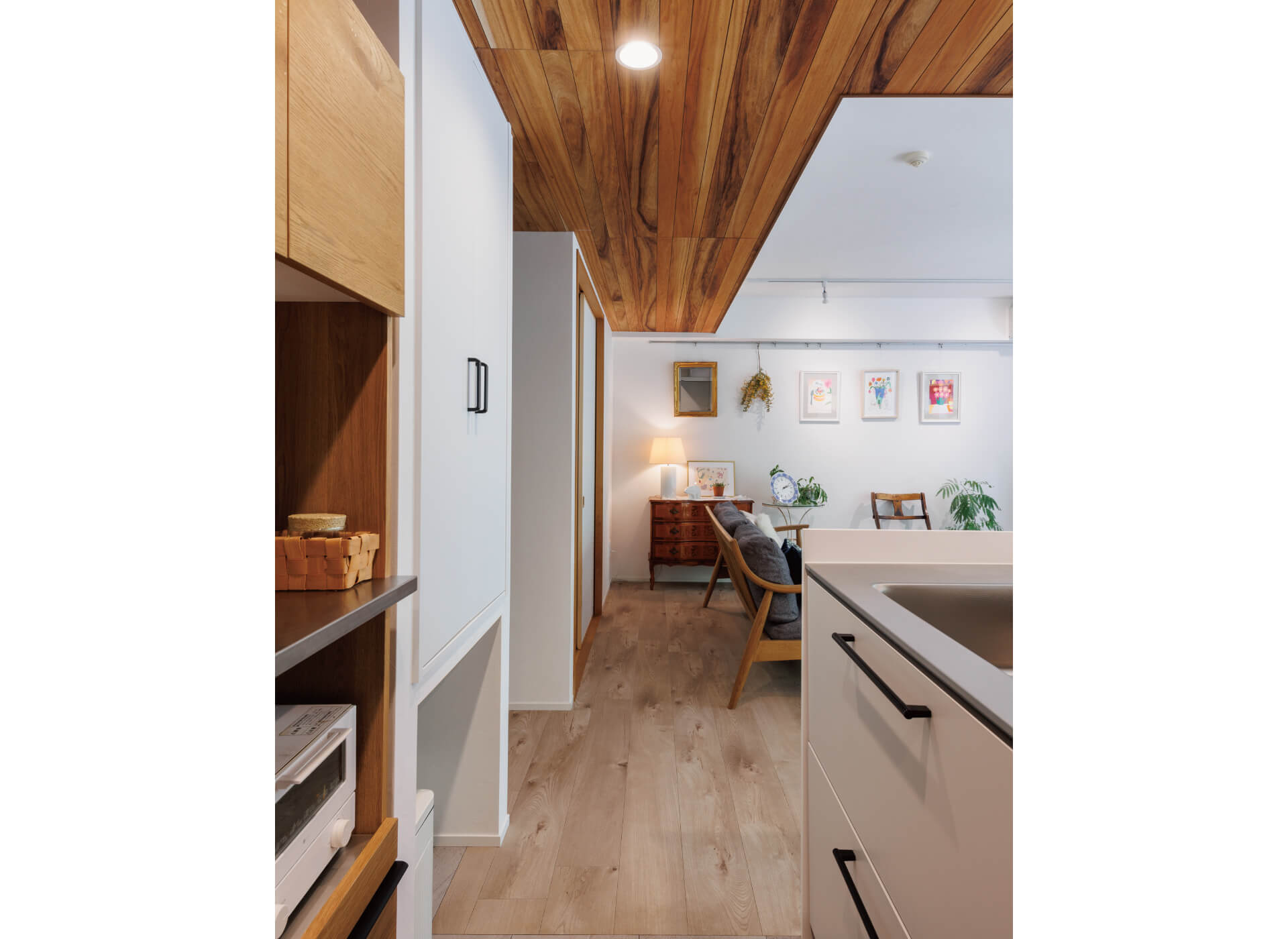 下がり天井のアカシアの無垢材と、ホワイトオーク柄の床材でコーディネイト。異なる木の表情を楽しめます。