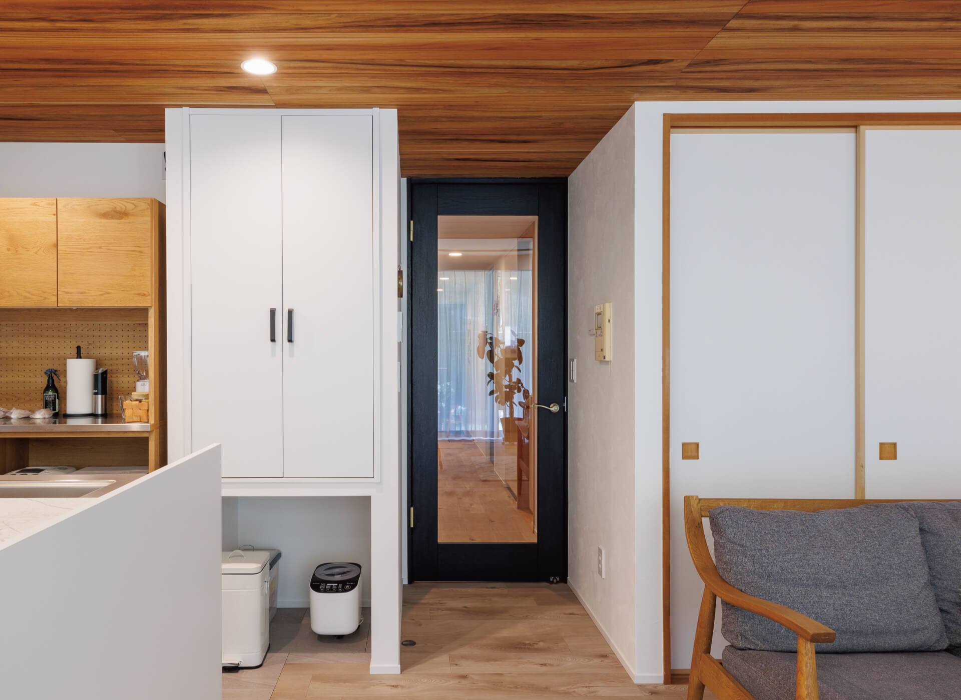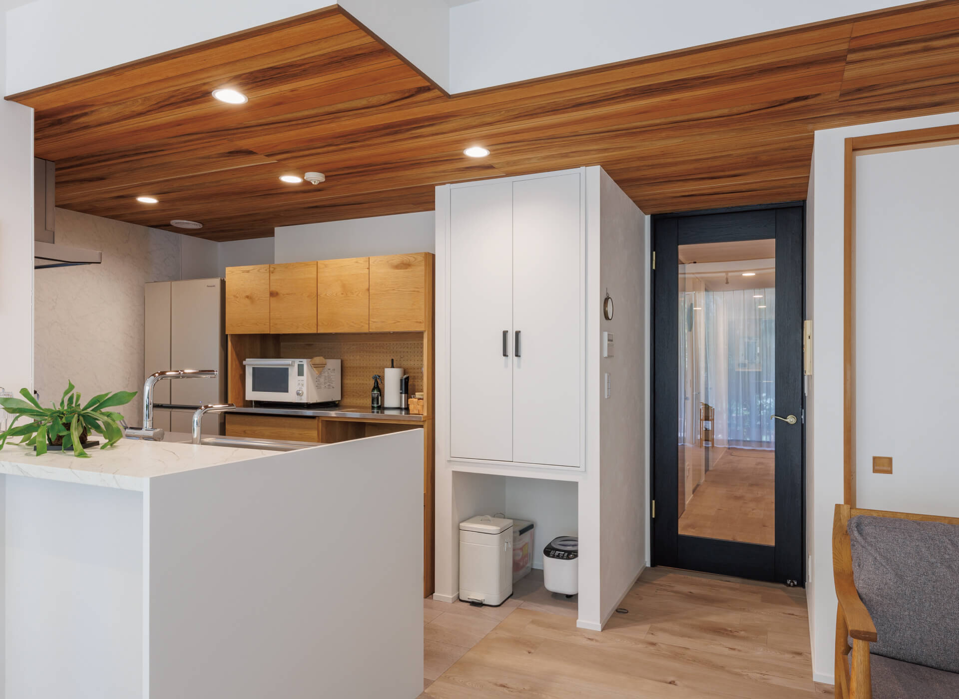 キッチンから横につながる下がり天井は、LDKのアクセントに。ブラックオーク柄のドアが空間を引き締めています。