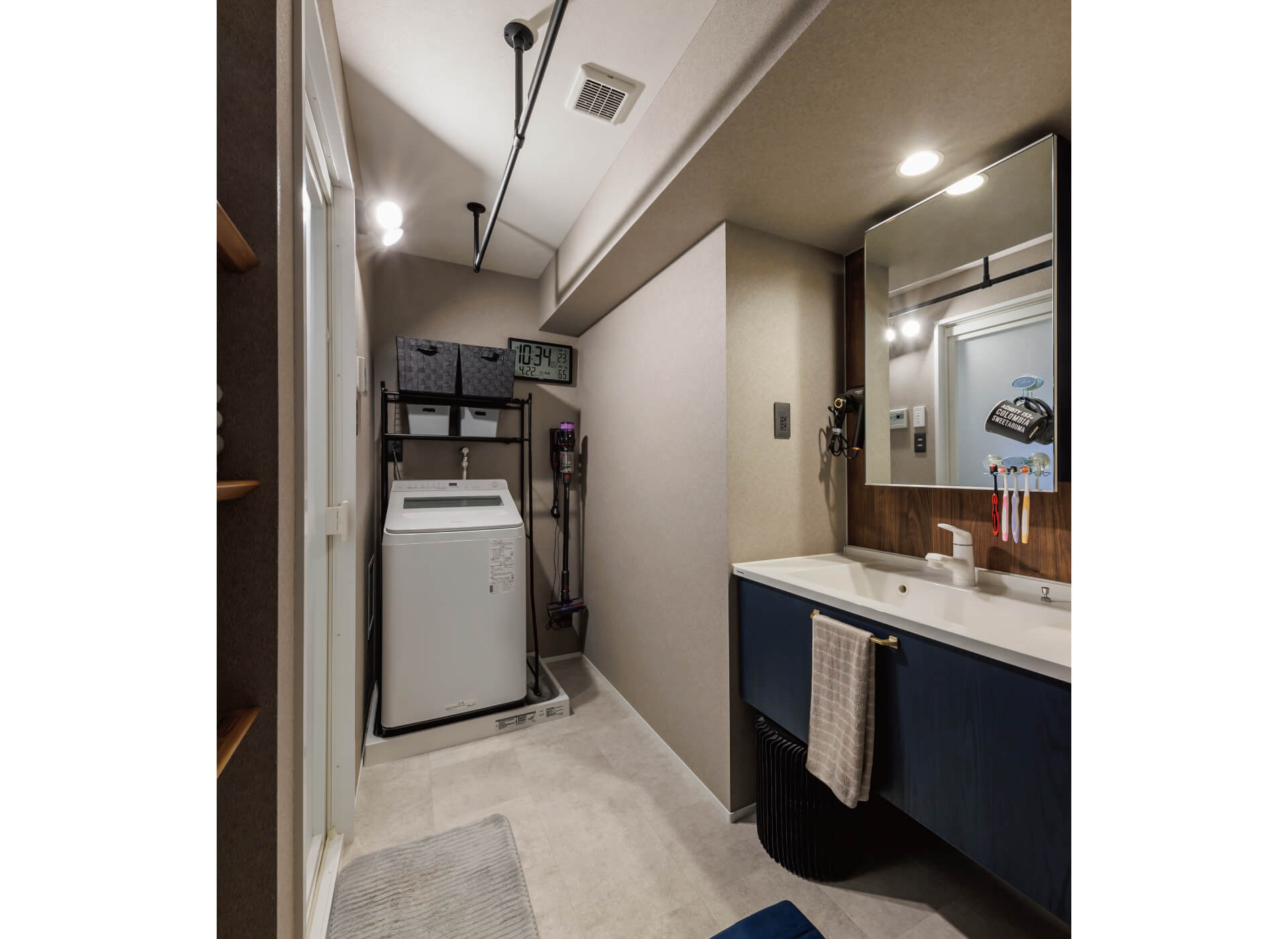 浴室と脱衣室の狭さに加え、住まいの傷みが気になっておられたA様。和室の押し入れスペースを取り込んで、ゆったり着替えられるランドリールームに。天井にはハンギングバーを取り付け、部屋干しができるようにしました。グレーを基調にしたヴィンテージモダンな空間です。