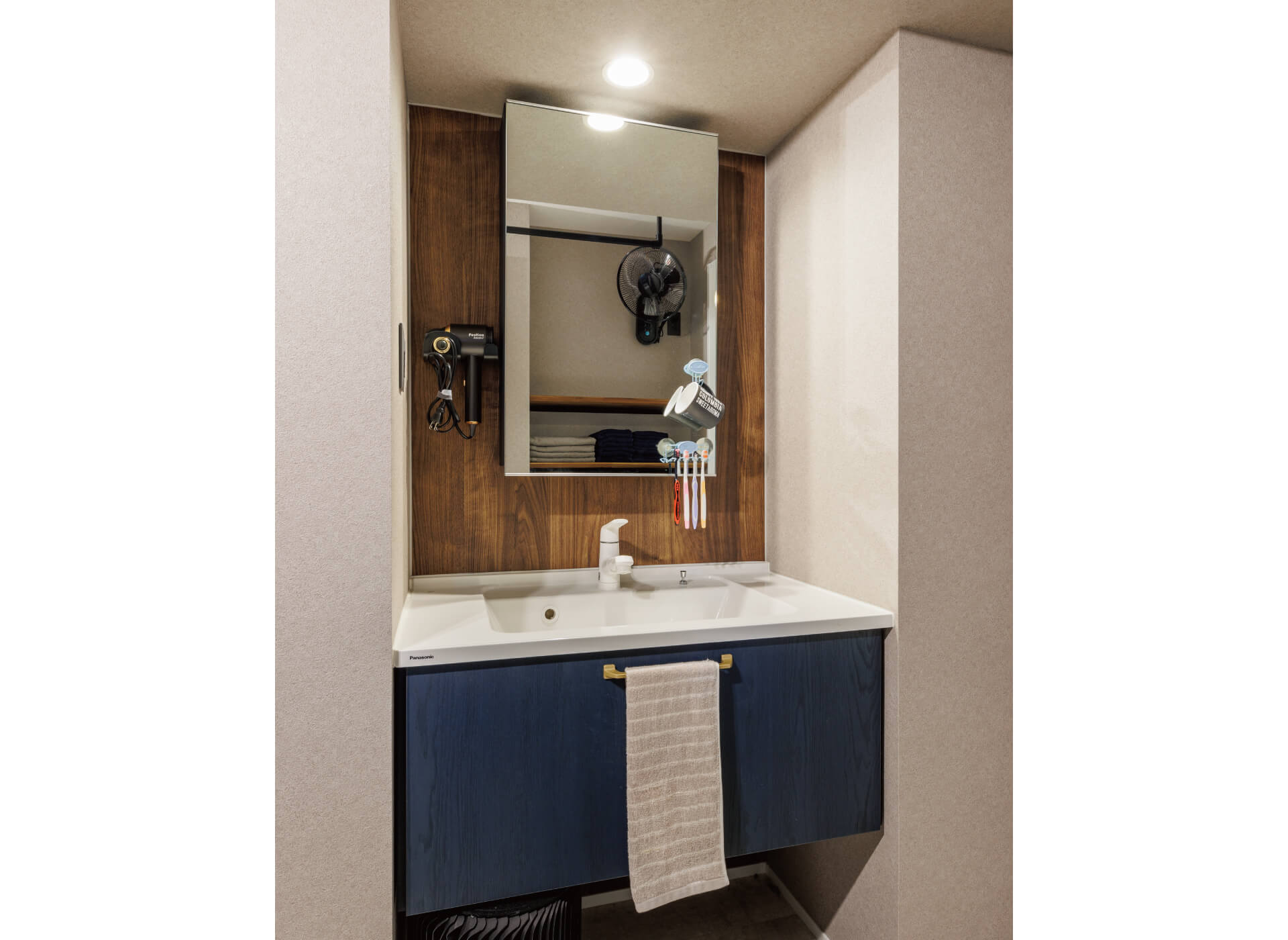 洗面台はおしゃれなネイビーのフロートタイプに。「鏡の裏側にもこんなにたくさん収納できるなんて」と喜んでいただきました。