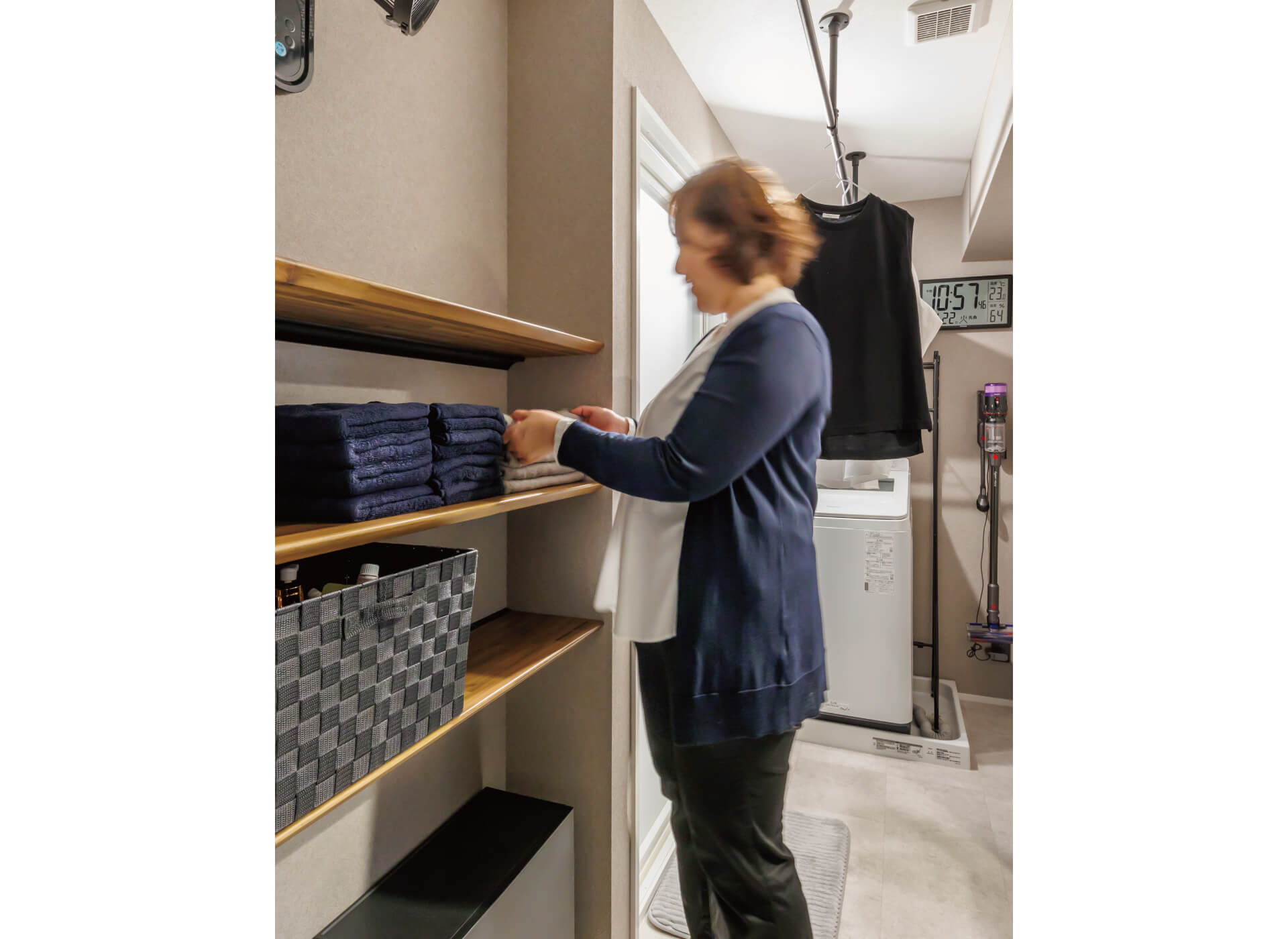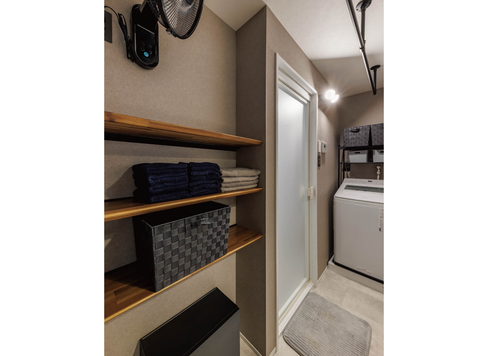 浴室のすぐ横に棚を設置して、入浴後すぐにタオルを使えるように。棚の壁面に付けたコンセントも便利。