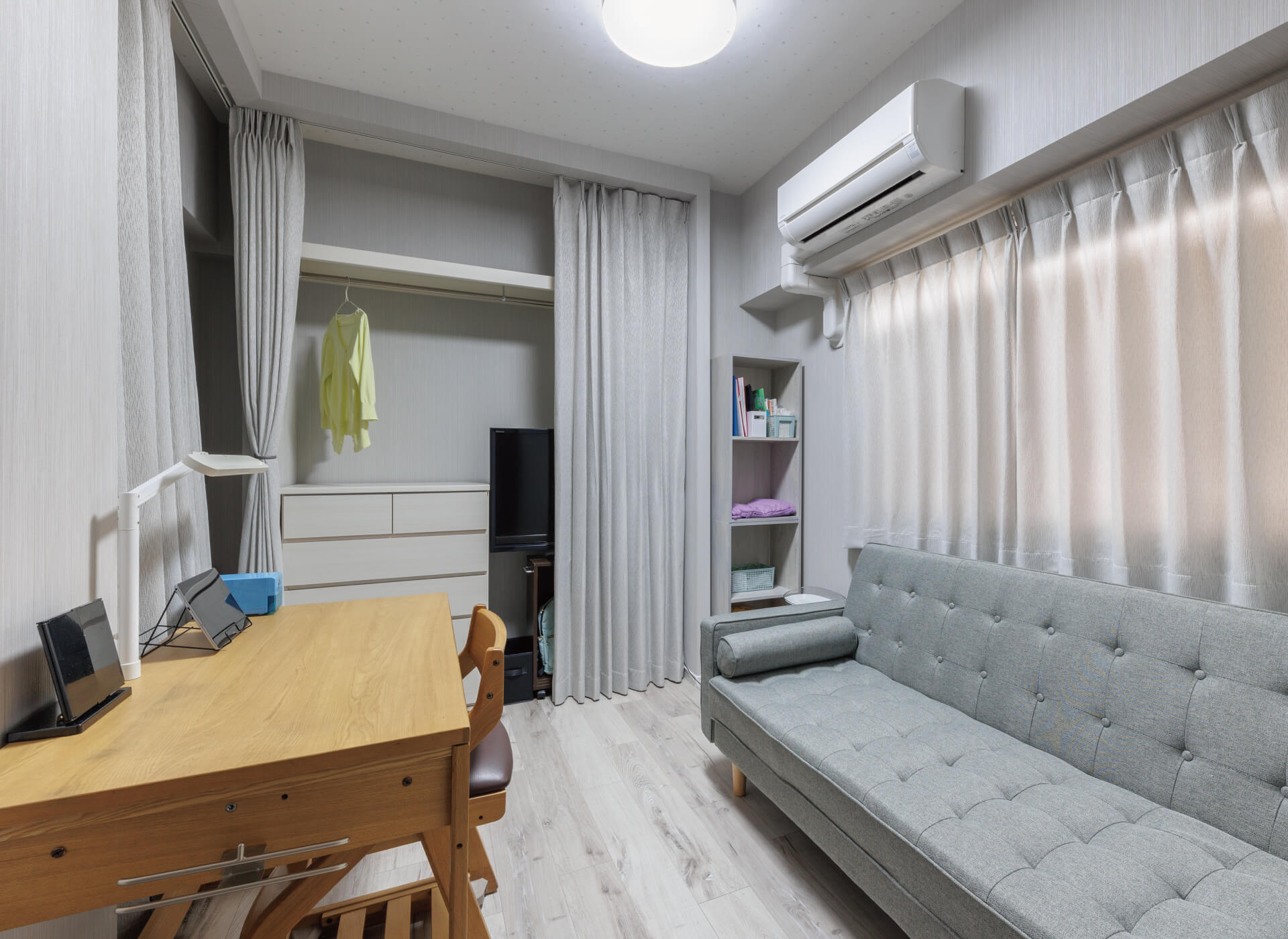 クローゼットを拡張した娘様の部屋。収納は扉を付けず、カーテンにすることでフレキシブルな使いやすさを。グレーを基調に、子どもすぎないインテリアでまとめました。