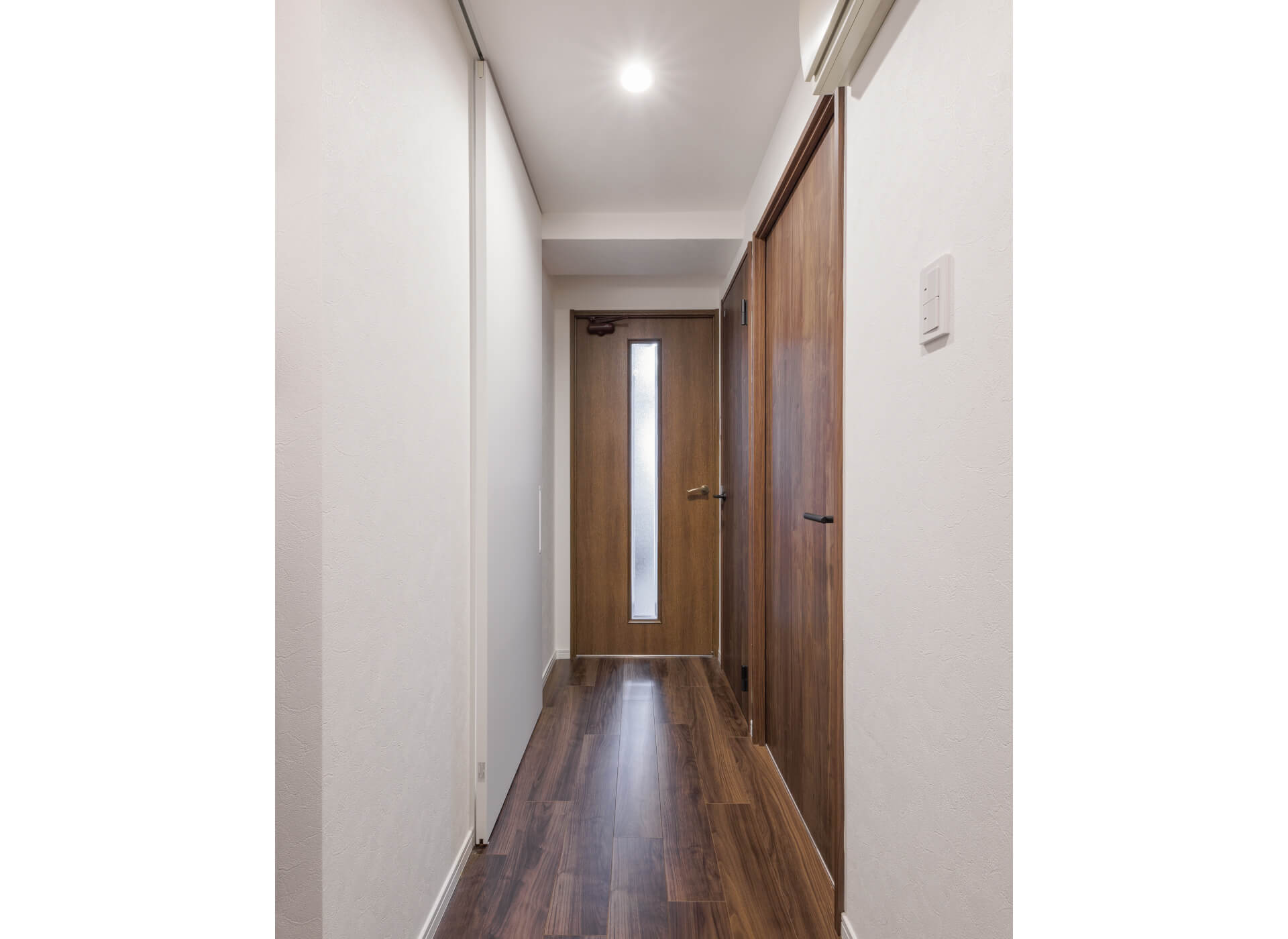 ウォールナット柄の床とホワイトの壁のコントラストが美しい廊下。洗面室の入口は、あえてホワイトにすることで圧迫感を軽減しています。