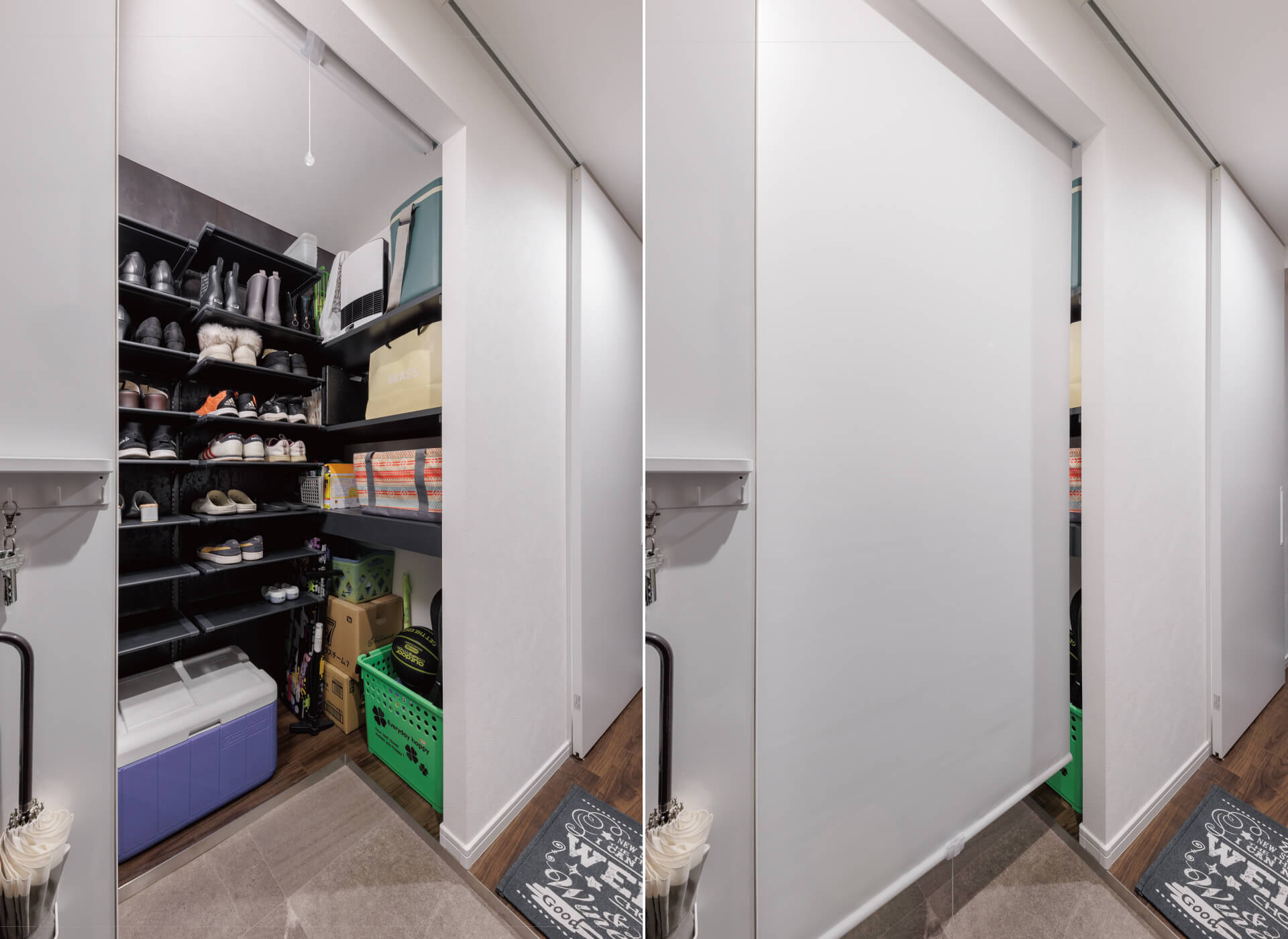 玄関横に大きなシューズクロークを設置。ゴミ出しまでの仮置き場としても重宝されています。ロールスクリーンを閉めれば、さりげなく目隠しできます。