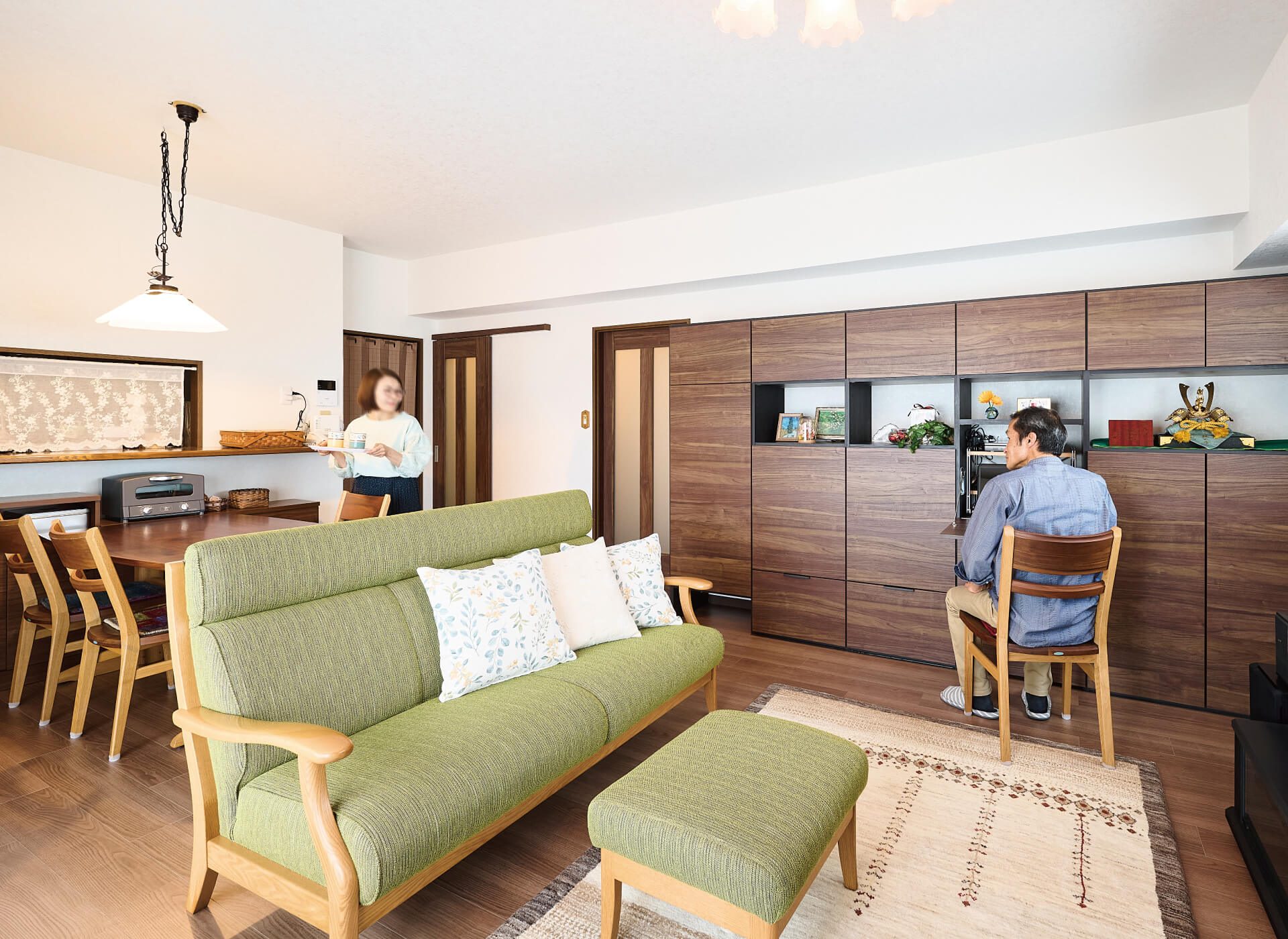 リビングの壁面収納は、落ち着いた色合いのウォールナット柄に。同時に木目柄の床材、淡いグリーンのアクセントクロスに替えて、やさしい上品な空間になりました。