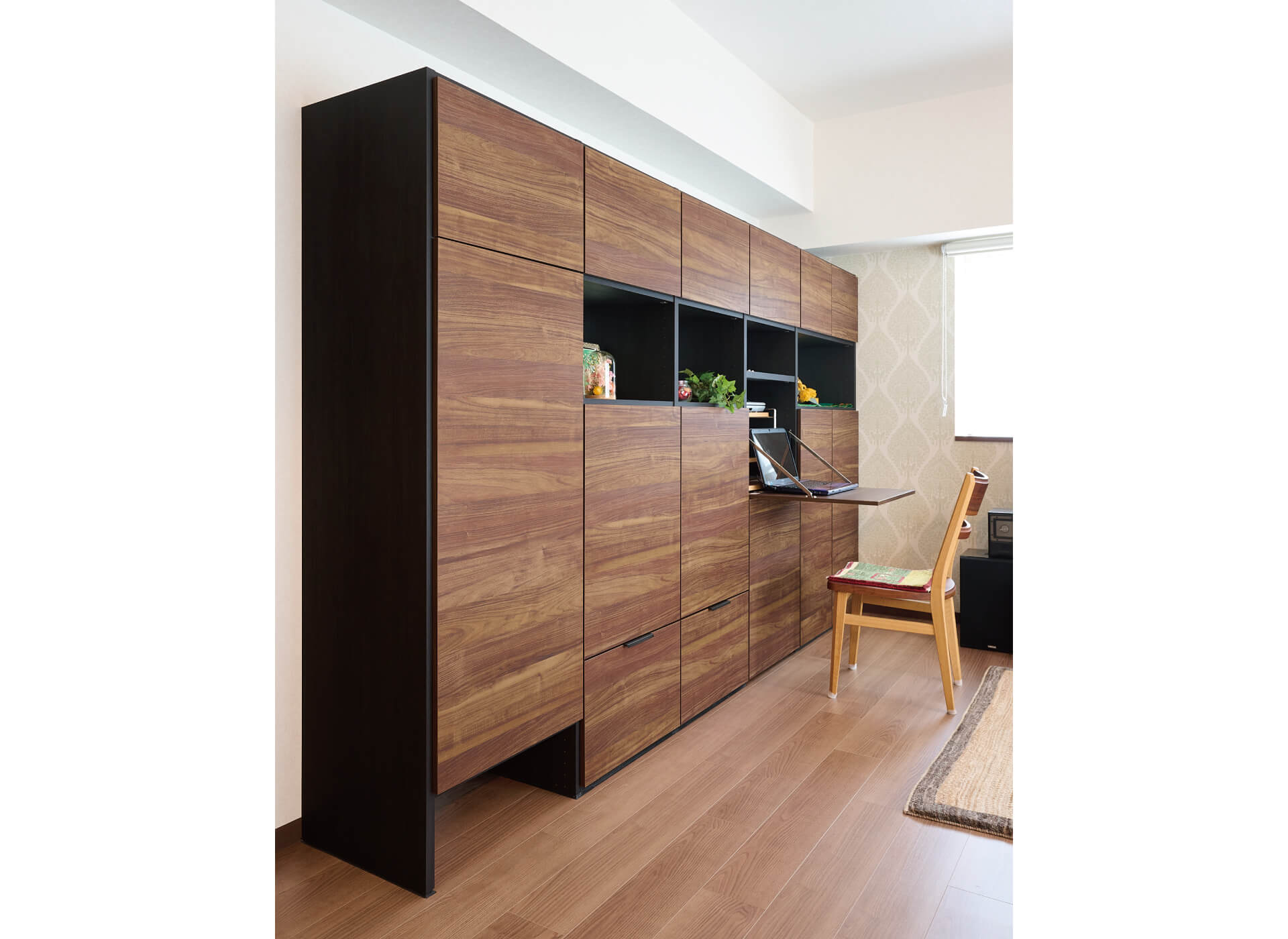 壁面収納は梁の下に納まる高さに設計して、圧迫感を軽減。また上貼りできる床材を選んで、マンションで工事の騒音を抑えたいというO様のご要望にお応えしました。